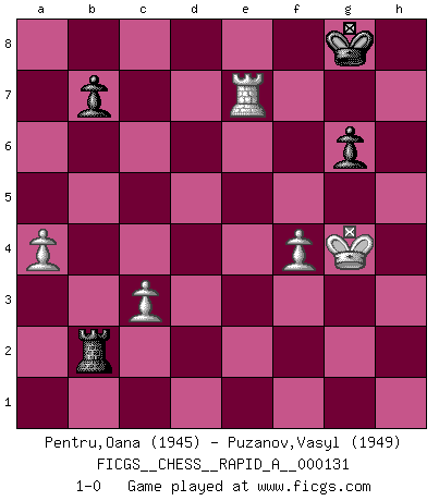 Last move : 1-0 2013 February 18 17:29:13 [Event "FICGS__CHESS__RAPID_A__000131"] [Site "FICGS"] [Date "2012.10.27"] [Round "1"] [White "Pentru,Oana"] [Black "Puzanov,Vasyl"] [Result "1-0"] [WhiteElo "1945"] [BlackElo "1949"] 1.e4 c5 2.Nf3 d6 3.Bb5+ Bd7 4.Bxd7+ Nxd7 5.O-O g6 6.c3 Bg7 7.d4 Qb6 8.Re1 Ngf6 9.e5 dxe5 10.dxe5 Ng4 11.Qa4 c4 12.Re2 Qc7 13.e6 fxe6 14.h3 Nge5 15.Nxe5 Bxe5 16.Na3 Rc8 17.Qxa7 O-O 18.Bh6 Rf5 19.Qe3 Nf6 20.Nb5 Qd7 21.g4 Bf4 22.Bxf4 Rxb5 23.Bg3 Ra8 24.a3 e5 25.Bxe5 Nxg4 26.hxg4 Rxe5 27.Qxe5 Qxg4+ 28.Kf1 Qh3+ 29.Ke1 Qh1+ 30.Kd2 Qxa1 31.Qd5+ Kf8 32.Kc2 Qf1 33.Qf3+ Kg8 34.Rxe7 Qd3+ 35.Qxd3 cxd3+ 36.Kxd3 Rb8 37.f4 h5 38.a4 h4 39.Ke3 h3 40.Kf3 Rd8 41.Kg3 Rd3+ 42.Kh2 Rd2+ 43.Kxh3 Rxb2 44.Kg4 1-0 Sicilian : Canal-Sokolsky attack, 3...Bd7 Kingside Castling by player White (move 5) Kingside Castling by player Black (move 17) 10 pieces endgame at move 43 : White KRPPPP , Black KRPP WHITE : King + 1 Rook 4 Pawns BLACK : King + 1 Rook 2 Pawns 9 pieces endgame at move 43 : White KRPPP , Black KRPP WHITE : King + 1 Rook 3 Pawns BLACK : King + 1 Rook 2 Pawns Player White won this chess game. Follow this game move after move (download)Robert Fischer is a law unto himself. (Larry Evans) Ein unbeabsichtigtes Patt ist der Gipfel der Dummheit. (Anonymous) Cuando la partida de Ajedrez termina, el Peón y el Rey regresan a la misma caja. (Irish saying) Nous vivons dans un monde échiquéen : chaque jour qui passe est un défi à relever. (Philosophe Sasha) Good decisions come from experience, and experience comes from bad decisions. (Anonymous)