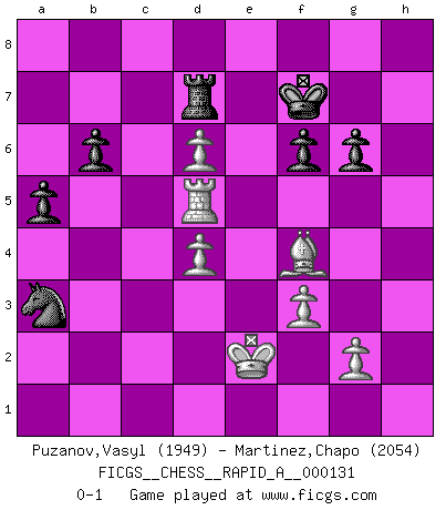 Last move : 0-1 2013 February 7 21:31:13 [Event "FICGS__CHESS__RAPID_A__000131"] [Site "FICGS"] [Date "2012.10.27"] [Round "1"] [White "Puzanov,Vasyl"] [Black "Martinez,Chapo"] [Result "0-1"] [WhiteElo "1949"] [BlackElo "2054"] 1.d4 Nf6 2.c4 e6 3.Nc3 Bb4 4.a3 Bxc3+ 5.bxc3 c5 6.Nf3 O-O 7.Bg5 Qa5 8.Bd2 b6 9.e3 Bb7 10.Be2 Qa6 11.O-O Bxf3 12.Bxf3 Nc6 13.e4 cxd4 14.cxd4 Qxc4 15.Be3 Qc3 16.Qa4 Qa5 17.Qxa5 Nxa5 18.e5 Nd5 19.Bxd5 exd5 20.Rfb1 d6 21.exd6 Rad8 22.Bf4 Rfe8 23.Rb5 Re4 24.Be5 f6 25.f3 Re2 26.Bg3 Nc4 27.Kh1 Kf7 28.Rxd5 g6 29.Rc1 Rb2 30.a4 Rb4 31.Re1 Rd7 32.Kg1 a6 33.h4 Rxa4 34.h5 Ra3 35.Kf2 Rb3 36.Bf4 Rb2+ 37.Kf1 a5 38.hxg6+ hxg6 39.Re2 Rxe2 40.Kxe2 Na3 0-1 Nimzo-Indian : Saemisch variation Kingside Castling by player Black (move 6) Kingside Castling by player White (move 11) Player Black won this chess game. Follow this game move after move (download)The King is a fighting piece. Use it ! (Wilhelm Steinitz) Ein Teil des Fehlers ist immer korrekt. (Savielly Grigorievitsch Tartakower) La estratégia requiere pensar, la táctica requiere observación. (Max Euwe) Seul un grand joueur sait à quel point il joue faiblement. (Xavier Tartacover) Man is reluctant to give credit for intelligence to anyone, except his enemies. (Albert Einstein)