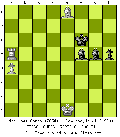 Last move : 1-0 2013 March 21 19:57:48 [Event "FICGS__CHESS__RAPID_A__000131"] [Site "FICGS"] [Date "2012.10.27"] [Round "1"] [White "Martinez,Chapo"] [Black "Domingo,Jordi"] [Result "1-0"] [WhiteElo "2054"] [BlackElo "1980"] 1.d4 h6 2.e4 c5 3.dxc5 e6 4.Be3 Na6 5.Nc3 Nxc5 6.Nf3 b6 7.b4 Na6 8.a3 Nc7 9.Be2 Bb7 10.O-O Nf6 11.Qd4 Be7 12.e5 Nfd5 13.Nxd5 Nxd5 14.Bd2 d6 15.Rad1 dxe5 16.Bb5+ Kf8 17.Nxe5 Nf6 18.Qxd8+ Bxd8 19.Be3 Bc7 20.Nd7+ Ke7 21.Nxf6 Kxf6 22.Rd7 Rac8 23.f4 Rhd8 24.Bd4+ Kg6 25.Bd3+ Kh5 26.g4+ Kxg4 27.Be2+ Kh3 28.Rd1 Be4 29.Rxf7 b5 30.c4 Rxd4 31.Rxd4 Bb6 32.Bf1+ Kh4 33.c5 Rxc5 34.bxc5 Bxc5 35.Rfd7 Bd5 36.Bxb5 Bxd4+ 37.Kf1 Kh3 38.Bc6 Bc4+ 39.Ke1 Bc3+ 40.Kf2 a5 41.Bg2+ Kh4 42.a4 g5 43.fxg5 Kxg5 44.Bc6 e5 45.Kf3 Be6 46.Rg7+ Kf6 47.Rh7 Kg5 48.h4+ Kg6 49.Re7 Kf6 50.Rc7 Be1 51.Ra7 Bf7 52.Ra6 Kg7 53.Be4 Bh5+ 54.Ke3 Bf7 55.Bf3 h5 56.Bc6 Bb4 57.Bb5 Bg6 58.Re6 Bc3 59.Be8 Bf5 60.Rd6 Bd4+ 61.Kd2 Bf2 62.Rd5 Bxh4 63.Rxe5 Bg5+ 64.Ke1 Kf6 65.Rxa5 1-0 Queen's pawn Kingside Castling by player White (move 10) 10 pieces endgame at move 62 : White KRBP , Black KBBPPP WHITE : King + 1 Rook 1 Bishop 1 Pawn BLACK : King + 2 Bishops 3 Pawns 9 pieces endgame at move 63 : White KRBP , Black KBBPP WHITE : King + 1 Rook 1 Bishop 1 Pawn BLACK : King + 2 Bishops 2 Pawns 8 pieces endgame at move 65 : White KRBP , Black KBBP WHITE : King + 1 Rook 1 Bishop 1 Pawn BLACK : King + 2 Bishops 1 Pawn Player White won this chess game. Follow this game move after move (download)Chess is a fighting game which is purely intellectual and includes chance. (Richard Reti) Ich rechne überhaupt nicht voraus. Ich gewinne auch so. (Robert James Fischer) Por la belleza de sus partidas, la claridad de su juego y lo brillante de sus ideas, Fischer se creó el mismo como un artista de la misma estatura como Brahms, Rembrandt y Shakespeare. (David Levy) L'ordinateur a tué l'originalité. Il n'y a plus guère d'aventures sur l'échiquier. (Jacob Murray) Strategy without tactics is the slowest route to victory. Tactics without strategy is the noise before defeat. (Sun Tzu)