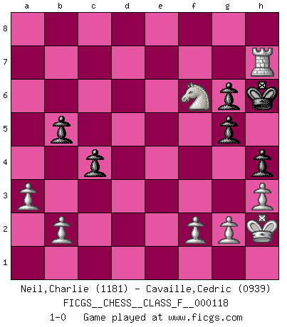 Last move : 1-0 2012 November 26 21:40:8 [Event "FICGS__CHESS__CLASS_F__000118"] [Site "FICGS"] [Date "2012.10.27"] [Round "1"] [White "Neil,Charlie"] [Black "Cavaille,Cedric"] [Result "1-0"] [WhiteElo "1181"] [BlackElo "0939"] 1.d4 Nf6 2.c4 d5 3.Nc3 dxc4 4.e3 Be6 5.Nf3 Nc6 6.Be2 Bd5 7.O-O e6 8.Qa4 Be7 9.Ne5 Qd7 10.Re1 O-O 11.Nxd7 Nxd7 12.Bxc4 Bxc4 13.Qxc4 a6 14.a3 Bd6 15.h3 Ne7 16.e4 b5 17.Qe2 c5 18.d5 exd5 19.exd5 c4 20.Bg5 f6 21.Qe6+ Rf7 22.Qxd6 fxg5 23.Rxe7 Rxe7 24.Qxe7 Nf6 25.d6 Re8 26.Qxe8+ Nxe8 27.Rd1 Nxd6 28.Rxd6 h6 29.Ne4 Kh7 30.Rxa6 h5 31.Kh2 g6 32.Nf6+ Kh6 33.Ra7 h4 34.Rh7+ 1-0 Queen's pawn game Kingside Castling by player White (move 7) Kingside Castling by player Black (move 10) Player White won this chess game. Follow this game move after move (download)Chess books should be used as we use glasses: to assist the sight, although some players make use of them as if they thought they conferred sight. (Jose Raul Capablanca) Gegen einen Schachcomputer zu verlieren ist wie Löcher in den Strümpfen zuhaben. Es ist nicht peinlich, solange man der einzige ist der es weiß. (Anonymous) Debemos de asegurarnos de que el Ajedrez no se convierta en un lenguaje muerto, muy interesante, pero tan solo para un grupo muy pequeño. (Sytze Faber) Vouloir jouer aux échecs contre soi-même est aussi paradoxal que vouloir marcher sur son ombre. (Stefan Zweig) Follow your passion, and success will follow you. (Arthur Buddhold)