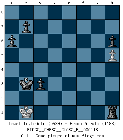 Last move : 0-1 2012 October 27 22:41:52 [Event "FICGS__CHESS__CLASS_F__000118"] [Site "FICGS"] [Date "2012.10.27"] [Round "1"] [White "Cavaille,Cedric"] [Black "Bromo,Alexis"] [Result "0-1"] [WhiteElo "0939"] [BlackElo "1188"] 1.d4 d5 2.Nc3 Nf6 3.Bg5 e6 4.Bxf6 Qxf6 5.Nf3 Nc6 6.e4 Bb4 7.Bb5 Bd7 8.O-O a6 9.Bxc6 Bxc6 10.exd5 exd5 11.Re1+ Be7 12.Ne5 O-O-O 13.Nxc6 Qxc6 14.Qg4+ Kb8 15.Qxg7 Bf6 16.Qxf7 Bxd4 17.Qf3 Rdf8 18.Qxd5 Bxf2+ 19.Kh1 Qxd5 20.Nxd5 Bxe1 21.Rxe1 c6 22.Nb6 Ka7 23.Nd7 Rd8 24.Nf6 h6 25.h4 Rhf8 26.Ne4 Kb6 27.g4 Rf4 28.Kh2 Rxg4 29.Kh3 Rdg8 30.Nf6 Rg3+ 31.Kh2 Rg2+ 32.Kh1 R8g6 33.Ne4 Rxc2 34.Re3 Re6 35.Rb3+ Kc7 36.Rc3 Rxb2 37.h5 Rxe4 38.Rg3 Re1+ 39.Rg1 Rxg1+ 40.Kxg1 c5 41.Kf1 c4 42.Ke1 c3 43.Kd1 Rxa2 44.Kc1 Kc6 45.Kb1 Rh2 46.Kc1 Kc5 47.Kd1 Kc4 48.Kc1 Kb3 49.Kb1 Rh1+ 0-1 Richter-Veresov attack Kingside Castling by player White (move 8) Queenside Castling by player Black (move 12) 10 pieces endgame at move 39 : White KPP , Black KRRPPPP WHITE : King + 2 Pawns BLACK : King + 2 Rooks 4 Pawns 9 pieces endgame at move 40 : White KPP , Black KRPPPP WHITE : King + 2 Pawns BLACK : King + 1 Rook 4 Pawns 8 pieces endgame at move 43 : White KP , Black KRPPPP WHITE : King + 1 Pawn BLACK : King + 1 Rook 4 Pawns Player Black won this chess game. Follow this game move after move (download)You sit at the board and suddenly your heart leaps. Your hand trembles to pick up the piece and move it. But what Chess teaches you is that you must sit there calmly and think about whether it's really a good idea and whether there are other better ideas. (Stanley Kubrick) Jede Eröffnung ist gut genug um gespielt zu werden, wenn nur ihr Ruf schlecht genug ist. (Savielly Grigorievitsch Tartakower) Tu cuerpo tiene que estar en óptima condición. Tu Ajedrez se deteriora como lo hace tu cuerpo. No puedes separar la mente y el cuerpo. (Bobby Fischer) Les sacrifices démontrent seulement que quelqu'un a gaffé. (Savielly Tartacover) You can only get smarter by playing a smarter opponent. (Revolver, movie)