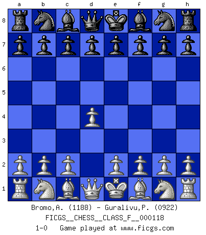 Last move : 1-0 2012 December 6 23:33:3 [Event "FICGS__CHESS__CLASS_F__000118"] [Site "FICGS"] [Date "2012.10.27"] [Round "1"] [White "Bromo,Alexis"] [Black "Guralivu,Paul-Iosif"] [Result "1-0"] [WhiteElo "1188"] [BlackElo "0922"] 1.d4 1-0 This chess game has been lost on time (started : 2012.10.27 18:34:47) Queen's pawn Player White won this chess game. Follow this game move after move (download)A player surprised is half beaten. (Proverb) Jeder Schachmeister war einmal ein Anfänger. (Irving Chernev) Una buena memoria, concentración, imaginación y una fuerte voluntad, se requiere para llegar a ser un buen jugador. (Bobby Fischer) L'action d'une oeuvre littéraire se déroule sur un champ de bataille. Les masques et les types du drame moderne correspondent aux pièces du jeu d'échecs. L'intrigue correspond aux coups et aux gambits, c'est à dire aux techniques du jeu telles qu'utilisées et interprétées par les joueurs. Les tactiques et les péripéties [mouvements] correspondent aux coups exécutés par l'adversaire. (Viktor Shklovsky) Quotation,n.: The act of repeating erroneously the words of another. The words erroneously repeated. (Ambrose Bierce, The Devil's Dictionary)