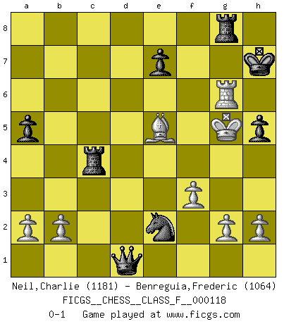 Last move : 0-1 2012 December 26 18:7:40 [Event "FICGS__CHESS__CLASS_F__000118"] [Site "FICGS"] [Date "2012.10.27"] [Round "1"] [White "Neil,Charlie"] [Black "Benreguia,Frederic"] [Result "0-1"] [WhiteElo "1181"] [BlackElo "1064"] 1.d4 d5 2.c4 dxc4 3.Nc3 g6 4.e3 a6 5.Bxc4 Bg7 6.Nge2 c6 7.Bd2 b5 8.Bd3 Nf6 9.O-O Bg4 10.f3 Be6 11.Rc1 b4 12.Ne4 Nxe4 13.Bxb4 Nd6 14.Bb1 Nc4 15.Nf4 Nxe3 16.Qd2 Nf5 17.Nxe6 fxe6 18.Be4 Bxd4+ 19.Rf2 Bxf2+ 20.Qxf2 O-O 21.Bxc6 Nxc6 22.Rxc6 e5 23.Qc2 a5 24.Qc4+ Kg7 25.Bc3 Qd1+ 26.Kf2 Nd4 27.Kg3 Ne2+ 28.Kg4 h5+ 29.Kg5 Rf5+ 30.Kh4 Rf4+ 31.Kg5 Rxc4 32.Bxe5+ Kh7 33.Rxg6 Rg8 0-1 Queen's gambit accepted Kingside Castling by player White (move 9) Kingside Castling by player Black (move 20) Player Black won this chess game. Follow this game move after move (download)A thorough understanding of the typical mating continuations makes the most complicated sacrificial combinations leading up to them not only not difficult, but almost a matter of course. (Siegbert Tarrasch) Ein Schachspiel besteht aus drei Phasen: Die erste, wenn du hofftst den Vorteil zu haben, die zweite, wenn du glaubst einen Vorteil zu haben, und die dritte.... wenn du weißt Du wirst verlieren. (Savielly Grigorievitsch Tartakower) El Ajedrez es como la guerra en un tablero. (Bobby Fischer) Mais n'est-ce pas déjà le limiter injurieusement que d'appeler les échecs un jeu? N'est-ce pas aussi une science, un art, ou quelque chose qui, comme le cercueil de Mahomet entre ciel et terre, est suspendu entre l'un et l'autre, et qui réunit un nombre incroyable de contraires ? (Stefan Zweig) The bottom line is always the bottom line. (Johann Piek)