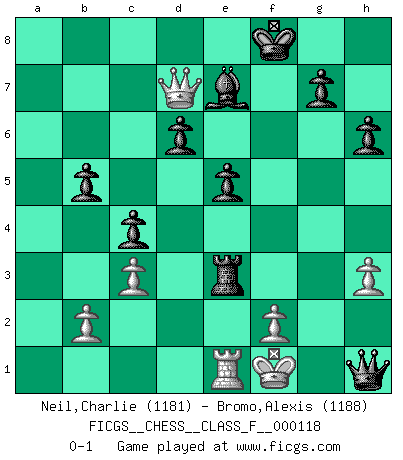 Last move : 0-1 2012 November 17 14:9:20 [Event "FICGS__CHESS__CLASS_F__000118"] [Site "FICGS"] [Date "2012.10.27"] [Round "1"] [White "Neil,Charlie"] [Black "Bromo,Alexis"] [Result "0-1"] [WhiteElo "1181"] [BlackElo "1188"] 1.e4 e5 2.Nf3 Nc6 3.Bb5 d6 4.d4 a6 5.Ba4 b5 6.Bb3 h6 7.O-O Nf6 8.Re1 Bg4 9.d5 Nd4 10.Nbd2 c5 11.c3 Nxb3 12.Qxb3 c4 13.Qc2 Be7 14.h3 Bh5 15.Nh4 Nxe4 16.Nxe4 Bxh4 17.Be3 Bg6 18.Bd2 f5 19.Ng3 f4 20.Nf5 Bxf5 21.Qxf5 Rf8 22.Qg6+ Rf7 23.Qe6+ Be7 24.a4 Kf8 25.axb5 axb5 26.Rxa8 Qxa8 27.Kf1 Rf6 28.Qd7 f3 29.gxf3 Rxf3 30.Kg2 Qxd5 31.Be3 Rxe3 32.Kf1 Qh1+ 0-1 Ruy Lopez : Old Steinitz defense Kingside Castling by player White (move 7) Player Black won this chess game. Follow this game move after move (download)For me, Chess is life and every game is like a new life. Every Chess player gets to live many lives in one lifetime. (Eduard Gufeld) Mein Name ist Rustam Kamsky. Sie haben meinen Sohn belästigt. Bereiten Sie sich aufs Sterben vor. (Rustam Kamsky) Realmente no sabemos como el juego fue inventado, aunque hay sospechas. Tan pronto como descubramos a los culpables, se los haremos saber. (Bruce Pandolfini) Demandez au pauvre Cg1 ce qu'il en pense. Eduard Gufeld à propos de la variante Saemisch de l'Est-Indienne. Chess is as much a mystery as women. (Purdy)