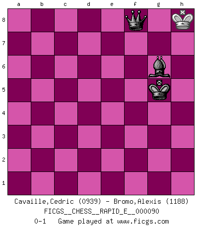 Last move : 0-1 2012 October 29 20:45:45 [Event "FICGS__CHESS__RAPID_E__000090"] [Site "FICGS"] [Date "2012.10.27"] [Round "1"] [White "Cavaille,Cedric"] [Black "Bromo,Alexis"] [Result "0-1"] [WhiteElo "0939"] [BlackElo "1188"] 1.d4 d5 2.Nf3 Nc6 3.Nc3 e6 4.e4 Bb4 5.Be2 Bxc3+ 6.bxc3 Nge7 7.exd5 exd5 8.c4 h6 9.O-O O-O 10.a4 Nb4 11.cxd5 Nbxd5 12.c4 Nc3 13.Qd3 Nxe2+ 14.Qxe2 Bg4 15.c5 Nd5 16.h3 Bf5 17.Ne5 Re8 18.Rb1 Bxb1 19.Qb5 Nc3 20.Qc4 Nxa4 21.Qxa4 Bh7 22.Rd1 Qd5 23.Qd7 Qxd7 24.Nxd7 Rad8 25.Ne5 Rxe5 26.Bf4 Re7 27.d5 a5 28.d6 cxd6 29.Bxd6 Red7 30.g4 a4 31.Ra1 Ra8 32.f4 a3 33.f5 f6 34.Kf2 g6 35.Ke2 gxf5 36.gxf5 Bxf5 37.h4 a2 38.Kd2 Kg7 39.Kc3 Kg6 40.Kb2 Kh5 41.Rxa2 Rxa2+ 42.Kxa2 Kxh4 43.Kb3 Kg4 44.Kb4 h5 45.Kb5 h4 46.c6 bxc6+ 47.Kxc6 Rxd6+ 48.Kxd6 h3 49.Ke7 h2 50.Kxf6 h1Q 51.Ke7 Qd5 52.Kf6 Qe6+ 53.Kg7 Kg5 54.Kf8 Bg6 55.Kg7 Qf7+ 56.Kh8 Qf8+ 0-1 Queen's pawn game, Chigorin variation Kingside Castling by player White (move 9) Kingside Castling by player Black (move 9) 10 pieces endgame at move 42 : White KBPP , Black KRBPPP WHITE : King + 1 Bishop 2 Pawns BLACK : King + 1 Rook 1 Bishop 3 Pawns 9 pieces endgame at move 42 : White KBP , Black KRBPPP WHITE : King + 1 Bishop 1 Pawn BLACK : King + 1 Rook 1 Bishop 3 Pawns 8 pieces endgame at move 46 : White KB , Black KRBPPP WHITE : King + 1 Bishop BLACK : King + 1 Rook 1 Bishop 3 Pawns 7 pieces endgame at move 47 : White KB , Black KRBPP WHITE : King + 1 Bishop BLACK : King + 1 Rook 1 Bishop 2 Pawns 6 pieces endgame at move 47 : White K , Black KRBPP WHITE : King + BLACK : King + 1 Rook 1 Bishop 2 Pawns 5 pieces endgame at move 48 : White K , Black KBPP WHITE : King + BLACK : King + 1 Bishop 2 Pawns 4 pieces endgame at move 50 : White K , Black KBP WHITE : King + BLACK : King + 1 Bishop 1 Pawn Promotion Queen by player Black (move 50) Player Black won this chess game. Follow this game move after move (download)Chess, like love, is infectious at any age. (Flohr) Frage: Gibt es etwas was Sie mehr lieben als Autobahnen ohne Tempobegrenzungen? - Antwort: Deutsche Frauen ohne Tempobegrenzungen. (Loek van Wely) El Ajedrez es despiadado: debes de estar preparado para matar gente. (Nigel Short) 'L'échange des dames est un coup dur pour les deux adversaires...' Un journaliste lors d'une partie du match Spassky-Fischer SEO proverb : Make your website optimized for human beings, not for search engines.