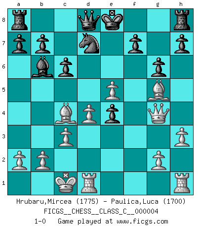 Last move : 1-0 2006 August 17 6:13:2 [Event "FICGS__CHESS__CLASS_C__000004"] [Site "FICGS"] [Date "2006.05.16"] [Round "1"] [White "Hrubaru,Mircea"] [Black "Paulica,Luca"] [Result "1-0"] [WhiteElo "1775"] [BlackElo "1700"] 1.e4 e5 2.f4 Bc5 3.Nf3 d6 4.c3 exf4 5.d4 Bb6 6.Bxf4 Bg4 7.h3 Bxf3 8.Qxf3 c6 9.Nd2 Nf6 10.O-O-O d5 11.e5 Ne4 12.Nxe4 dxe4 13.Qg4 g6 14.Bc4 Nd7 15.Bg5 1-0 This chess game has been lost on time (started : 2006.05.16 12:13:29) KGD : Classical, 4.c3 Queenside Castling by player White (move 10) Player White won this chess game. Follow this game move after move (download)Chess is the art which expresses the science of logic. (Mikhail Botvinnik) Ich liebe den Moment, wenn ich das Ego meines Gegenüber breche. (Robert James Fischer) Creo que una cierta cantidad de temperamento es esperada de los genios del Ajedrez. (Ron Gross) On entre au jeu d'Echecs comme on entre en Religion. Pour le joueur d'Echecs, la partie d'Echecs c'est l'office, la messe, le défilé du 1er Mai, le dépôt de gerbe au Monument aux Morts. C'est un drame sacré. (Michel Roos) The problem with troubleshooting is that trouble shoots back. (Anonymous)
