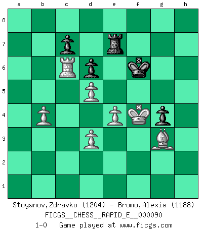 Last move : 1-0 2012 November 5 20:29:41 [Event "FICGS__CHESS__RAPID_E__000090"] [Site "FICGS"] [Date "2012.10.27"] [Round "1"] [White "Stoyanov,Zdravko"] [Black "Bromo,Alexis"] [Result "1-0"] [WhiteElo "1204"] [BlackElo "1188"] 1.e4 e5 2.Nf3 Nc6 3.Bb5 d6 4.Bxc6+ bxc6 5.h3 Nf6 6.d3 c5 7.O-O Ba6 8.Re1 g6 9.c3 Bg7 10.Ng5 O-O 11.c4 Re8 12.Nc3 Nh5 13.Nd5 Bh6 14.Nxf7 Kxf7 15.Bxh6 Bc8 16.Qf3+ Nf6 17.Bg5 Re6 18.Re3 Bb7 19.a3 Bxd5 20.cxd5 Re8 21.Qg3 Kg7 22.Qh4 h5 23.Rf3 Rf8 24.b4 cxb4 25.axb4 Rf7 26.g4 Qe7 27.Be3 a6 28.Qg5 Rh8 29.Rxa6 hxg4 30.hxg4 Nxg4 31.Qxg4 Rxf3 32.Qxf3 Rf8 33.Qh3 Rh8 34.Qg3 Qh4 35.Qf3 Qh2+ 36.Kf1 Qh1+ 37.Qxh1 Rxh1+ 38.Ke2 Kf6 39.Rc6 Rh7 40.f4 exf4 41.Bxf4 g5 42.Bg3 Re7 43.Ke3 g4 44.Kf4 1-0 Ruy Lopez : Old Steinitz defense Kingside Castling by player White (move 7) Kingside Castling by player Black (move 10) Player White won this chess game. Follow this game move after move (download)Before the endgame, the Gods have placed the middle game. (Siegbert Tarrasch) Ich spiele 70 Eröffnungssysteme. (Viktor Kortschnoi) El jugador de combinación piensa hacia adelante; comienza de la posición dada y trabaja las movidas contundentes en su mente. (Emanuel Lasker) Vous n'êtes pas toujours obligé de jouer le meilleur coup. Un coup doit être actif, entreprenant, correct et beau ! (David Bronstein) When you've done things right people won't know you've done anything at all. (Futurama)