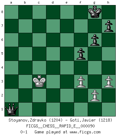 Last move : 0-1 2012 November 29 16:49:59 [Event "FICGS__CHESS__RAPID_E__000090"] [Site "FICGS"] [Date "2012.10.27"] [Round "1"] [White "Stoyanov,Zdravko"] [Black "Goti,Javier"] [Result "0-1"] [WhiteElo "1204"] [BlackElo "1218"] 1.e4 c5 2.Nf3 Nc6 3.Bb5 g6 4.Bxc6 bxc6 5.h3 Bg7 6.c3 Ba6 7.d3 d6 8.O-O Nf6 9.Re1 O-O 10.Bg5 Nd7 11.Bf4 e5 12.a3 exf4 13.c4 Bxb2 14.Ra2 Bg7 15.Qa4 Bb7 16.Qd1 Re8 17.Qd2 Qf6 18.Rc2 d5 19.cxd5 cxd5 20.Nc3 dxe4 21.dxe4 Ne5 22.Nxe5 Qxe5 23.Nd5 f5 24.Qxf4 Bxd5 25.Qxe5 Rxe5 26.Rxc5 Rxe4 27.Rec1 Bb7 28.Rc7 Rb8 29.f3 Ra4 30.Rd7 Bc8 31.Rdc7 Bb7 32.Re7 Rxa3 33.R1c7 Bd4+ 34.Kh2 a5 35.Rxb7 Rxb7 36.Rxb7 a4 37.Rb4 Be5+ 38.Kg1 Ra1+ 39.Kf2 a3 40.Ra4 Bb2 41.Rb4 Ra2 42.Rc4 Bc3 43.Ke3 Rc2 44.Kd3 a2 45.Rxc3 Rxc3+ 46.Kxc3 a1Q 0-1 Sicilian : Nimzovich-Rossolimo attack (with ...g6, without ...d6) Kingside Castling by player White (move 8) Kingside Castling by player Black (move 9) 10 pieces endgame at move 45 : White KPPP , Black KRPPPP WHITE : King + 3 Pawns BLACK : King + 1 Rook 4 Pawns 9 pieces endgame at move 46 : White KPPP , Black KPPPP WHITE : King + 3 Pawns BLACK : King + 4 Pawns Promotion Queen by player Black (move 46) Player Black won this chess game. Follow this game move after move (download)Everything is in a state of flux, and this includes the world of Chess. (Mikhail Botvinnik) Auf jeden Fall musst du zuerst Rechtsanwalt werden, damit du deine eigenen Interessen und die deiner Familie vertreten kannst. [Brief an seinen Sohn] (José Raúl Capablanca) Creo que una cierta cantidad de temperamento es esperada de los genios del Ajedrez. (Ron Gross) Le profane ne songe pas à la somme de jouissance dont il se prive, qui méconnaît ce jeu aux ressources aussi variées que passionnantes. (Jean-Marie Jeanton-Lamarche) Never was anything great achieved without danger. (Niccolo Machiavelli)