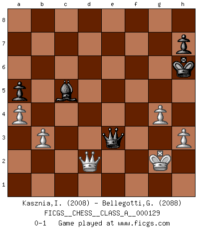 Last move : 0-1 2013 January 1 16:28:2 [Event "FICGS__CHESS__CLASS_A__000129"] [Site "FICGS"] [Date "2012.10.28"] [Round "1"] [White "Kasznia,Ireneusz"] [Black "Bellegotti,Giorgio"] [Result "0-1"] [WhiteElo "2008"] [BlackElo "2088"] 1.c4 e5 2.Nc3 Nf6 3.Nf3 Nc6 4.g3 d5 5.cxd5 Nxd5 6.Bg2 Nb6 7.O-O Be7 8.b3 O-O 9.Bb2 Bg4 10.a4 a5 11.Rc1 Re8 12.Nb5 e4 13.Ne5 Nxe5 14.Bxe5 c6 15.h3 Bf5 16.g4 cxb5 17.Bc7 Qd7 18.Bxb6 Be6 19.d3 Ba3 20.Rc7 Qd6 21.Rxb7 Bd5 22.Bc7 Qe7 23.Rxb5 exd3 24.Be5 Bxg2 25.Kxg2 Bb2 26.f4 f6 27.Qd2 Ba3 28.Qxd3 fxe5 29.Rxe5 Qb7+ 30.e4 Bb4 31.Qc4+ Kh8 32.Qd5 Qc7 33.Rxe8+ Rxe8 34.e5 g5 35.fxg5 Rxe5 36.Qd4 Kg8 37.Rc1 Bc5 38.Qc4+ Kg7 39.Qc3 Kg6 40.Qf3 Kxg5 41.Rd1 Qe7 42.Rd5 Rxd5 43.Qxd5+ Kh6 44.Qd2+ Qe3 0-1 English Opening Kingside Castling by player White (move 7) Kingside Castling by player Black (move 8) Player Black won this chess game. Follow this game move after move (download)The defensive power of a pinned piece is only imaginary. (Aaron Nimzovich) Der Schachmeister von Heute braucht Courage, einen Killerinstinkt, Ausdauer und Arroganz. (Larry Evans) El Ajedrez es un terrible juego. Si no controlas el centro, tu oponente tiene una posición mas holgada. Si tienes control del centro, ¡entonces realmente tu tienes algo de que preocuparte!. (Siegbert Tarrasch) Je ne suis pas le dernier à jouer lâchement des coups douteux pendant le zeïtnot de l'adversaire pour l'achever: en effet les coups qui font le plus peur sont ceux que l'on ne comprend pas. Je me fais souvent peur quand je joue. (Un professeur anonyme) I couldn't make any sense out of what this particular thread is about. It sounds like R2 D2 computer speaking. A space fight ?!? Some 'command' problems in Moscow ? Some killers & narcotic addicts attacking some game & a god wannabe ?? (Dinesh De Silva, lost in a russian conflict in FICGS forum)