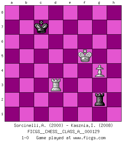Last move : 1-0 2013 April 2 19:14:10 [Event "FICGS__CHESS__CLASS_A__000129"] [Site "FICGS"] [Date "2012.10.28"] [Round "1"] [White "Sorcinelli,Andrea"] [Black "Kasznia,Ireneusz"] [Result "1-0"] [WhiteElo "2000"] [BlackElo "2008"] 1.e4 c5 2.Nf3 Nc6 3.Nc3 e6 4.d4 cxd4 5.Nxd4 Nf6 6.Be2 Bb4 7.O-O Bxc3 8.bxc3 Nxe4 9.Qd3 d5 10.Ba3 h6 11.Nxc6 bxc6 12.Rab1 Qf6 13.c4 Qc3 14.cxd5 Qxd3 15.Bxd3 cxd5 16.Bb5+ Bd7 17.Bxd7+ Kxd7 18.Rb7+ Kc6 19.Rxf7 g5 20.Re1 g4 21.c4 Rab8 22.f3 gxf3 23.Rxf3 Rhg8 24.cxd5+ exd5 25.Rc1+ Kb7 26.Rd3 Rgd8 27.Bb2 Ka8 28.Be5 Rb5 29.g3 h5 30.Kg2 Re8 31.Bd4 Kb7 32.Rf3 Rb4 33.Rf7+ Ka8 34.Rd1 Ra4 35.Rf5 Rxa2+ 36.Kh3 Rd8 37.Rxh5 a5 38.Bg1 Nc3 39.Rd3 Rc8 40.Bd4 Ne2 41.Be5 d4 42.Rh7 a4 43.Bxd4 Nxd4 44.Rxd4 Rb8 45.R7h4 a3 46.Ra4+ Kb7 47.Rhb4+ Kc8 48.Rxb8+ Kxb8 49.g4 Kc7 50.Kg3 Ra1 51.Kf4 Rh1 52.Rxa3 Rxh2 53.Rd3 Rf2+ 54.Ke5 Rg2 55.Kf5 1-0 Sicilian defense Kingside Castling by player White (move 7) 10 pieces endgame at move 43 : White KRRPP , Black KRRNP WHITE : King + 2 Rooks 2 Pawns BLACK : King + 2 Rooks 1 Knight 1 Pawn 9 pieces endgame at move 44 : White KRRPP , Black KRRP WHITE : King + 2 Rooks 2 Pawns BLACK : King + 2 Rooks 1 Pawn 8 pieces endgame at move 48 : White KRRPP , Black KRP WHITE : King + 2 Rooks 2 Pawns BLACK : King + 1 Rook 1 Pawn 7 pieces endgame at move 48 : White KRPP , Black KRP WHITE : King + 1 Rook 2 Pawns BLACK : King + 1 Rook 1 Pawn 6 pieces endgame at move 52 : White KRPP , Black KR WHITE : King + 1 Rook 2 Pawns BLACK : King + 1 Rook 5 pieces endgame at move 52 : White KRP , Black KR WHITE : King + 1 Rook 1 Pawn BLACK : King + 1 Rook Player White won this chess game. Follow this game move after move (download)Chess teaches you to control the initial excitement you feel when you see something that looks good and it trains you to think objectively when you're in trouble. (Stanley Kubrick) Mutter, ich bin eben Ex-Weltmeister geworden. --beim nach Hause Kommen nach dem Verlust des WM-Titels an Mihail Botvinnik -- (Mikhail Nekhemyevich Tal) En el Ajedrez, cuando menos, el valiente hereda la tierra. (Edmar Mednis) L'action d'une oeuvre littéraire se déroule sur un champ de bataille. Les masques et les types du drame moderne correspondent aux pièces du jeu d'échecs. L'intrigue correspond aux coups et aux gambits, c'est à dire aux techniques du jeu telles qu'utilisées et interprétées par les joueurs. Les tactiques et les péripéties [mouvements] correspondent aux coups exécutés par l'adversaire. (Viktor Shklovsky) If you are going through hell, keep going. (Winston Churchill)