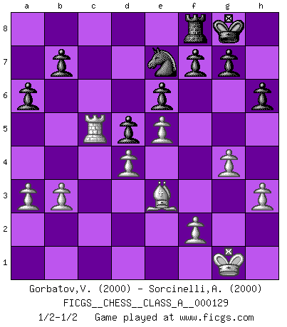 Last move : 1/2-1/2 2012 November 2 10:34:5 [Event "FICGS__CHESS__CLASS_A__000129"] [Site "FICGS"] [Date "2012.10.28"] [Round "1"] [White "Gorbatov,Valentin"] [Black "Sorcinelli,Andrea"] [Result "1/2-1/2"] [WhiteElo "2000"] [BlackElo "2000"] 1.e4 c6 2.d4 d5 3.e5 Bf5 4.Nf3 e6 5.Be2 c5 6.O-O Nc6 7.c3 cxd4 8.cxd4 Nge7 9.Be3 Bg4 10.Nh4 Bxe2 11.Qxe2 Rc8 12.Nc3 Na5 13.Nf3 Nc4 14.Nd2 Nxd2 15.Qxd2 Nf5 16.Rfc1 Bb4 17.a3 Bxc3 18.Rxc3 O-O 19.Rxc8 Qxc8 20.Rc1 Qd7 21.Qc3 Qb5 22.b3 a6 23.h3 h6 24.g4 Ne7 25.Qc5 Qxc5 26.Rxc5 1/2-1/2 Caro-Kann : Advance variation Kingside Castling by player White (move 6) Kingside Castling by player Black (move 18) This chess game ended in a draw. Follow this game move after move (download)In blitz, the Knight is stronger than the Bishop. (Vlastimil Hort) Ich war schon mal beim Dopingtest. Da musste ich Urin abgeben, während Dritte zusahen. (Elisabeth Pähtz) En el tablero, la mentira e hipocresía no sobreviven mucho. (Emanuel Lasker) Il s'avisa de me proposer d'apprendre les échecs qu'il jouait un peu... me voilà forcené des échecs. J'achète un échiquier, je m'enferme dans ma chambre, j'y passe des jours et des nuits à vouloir apprendre par cur toutes les parties. (Jean-Jacques Rousseau, Confessions) Indecision is the key to flexibility. (Unknown)