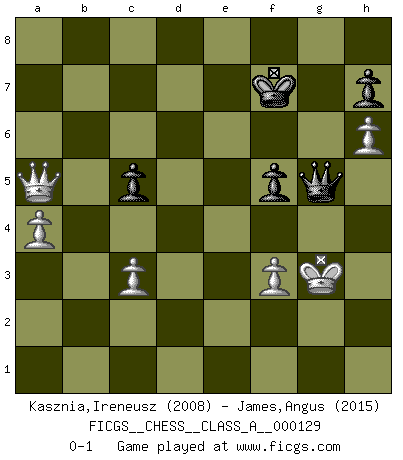 Last move : 0-1 2013 November 15 6:40:6 [Event "FICGS__CHESS__CLASS_A__000129"] [Site "FICGS"] [Date "2012.10.28"] [Round "1"] [White "Kasznia,Ireneusz"] [Black "James,Angus"] [Result "0-1"] [WhiteElo "2008"] [BlackElo "2015"] 1.c4 e6 2.Nf3 d5 3.d4 Nf6 4.Nc3 Be7 5.Bg5 O-O 6.e3 Nbd7 7.cxd5 Nxd5 8.Bxe7 Qxe7 9.Bd3 Nxc3 10.bxc3 c5 11.O-O b6 12.Qc2 f5 13.e4 Bb7 14.exf5 Bxf3 15.fxe6 Qxe6 16.gxf3 Kh8 17.Rfe1 Qf7 18.Rad1 Qxf3 19.Be4 Qg4+ 20.Bg2 Rae8 21.h3 Qh5 22.d5 Ne5 23.Re3 Nc4 24.Re6 Rd8 25.Rde1 Nd6 26.Re7 a6 27.Qd3 Nf5 28.R1e5 Qg5 29.R7e6 Qc1+ 30.Re1 Qf4 31.Rxb6 Nh4 32.Qg3 Nxg2 33.Kxg2 Qd2 34.Re5 Rf6 35.Rxf6 gxf6 36.Re4 Qxd5 37.Qf3 Qc6 38.a3 a5 39.a4 Rd1 40.h4 Rd8 41.h5 Rg8+ 42.Kf1 Qb6 43.Rg4 Qe6 44.Rxg8+ Kxg8 45.h6 Kf8 46.Qd3 f5 47.Qd8+ Kf7 48.Qc7+ Qe7 49.Qxa5 Qd7 50.f3 Qd1+ 51.Kg2 Qd2+ 52.Kg3 Qg5+ 0-1 This chess game has been lost on time (started : 2012.10.28 12:57:58) English Opening : Agincourt variation Kingside Castling by player Black (move 5) Kingside Castling by player White (move 11) Player Black won this chess game. Follow this game move after move (download)Some sacrifices are sound; the rest are mine. (Mikhail Tal) Oft bringt ein stiller Zug das Erdbeben. (Richard Reti) Todo se encuentra en un estado de flujo y esto incluye al mundo del Ajedrez. (Mikhail Botvinnik) Un journaliste : 'Vous préférez avoir une dame de plus sur l'échiquier ou au lit ?' Boris Spassky : 'Ca dépend de la position.' Yoga is 99% practice and 1% knowledge. (Sri Krishna Pattabhi Jois)