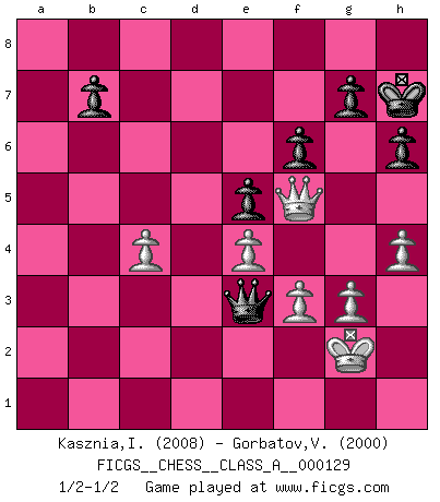 Last move : 1/2-1/2 2013 January 31 21:53:7 [Event "FICGS__CHESS__CLASS_A__000129"] [Site "FICGS"] [Date "2012.10.28"] [Round "1"] [White "Kasznia,Ireneusz"] [Black "Gorbatov,Valentin"] [Result "1/2-1/2"] [WhiteElo "2008"] [BlackElo "2000"] 1.c4 e5 2.Nc3 Nc6 3.g3 Bc5 4.Bg2 Nf6 5.e3 Bb6 6.Nge2 d6 7.O-O O-O 8.d4 h6 9.b3 Re8 10.Nd5 exd4 11.Nxb6 axb6 12.Nxd4 Ne4 13.Bb2 Bd7 14.Nb5 Rc8 15.Nc3 Nxc3 16.Bxc3 Qg5 17.Qc2 Qh5 18.Qb2 f6 19.Qd2 Nd8 20.a4 Bc6 21.a5 Bxg2 22.Kxg2 bxa5 23.Rxa5 Qg6 24.f3 Nc6 25.R5a1 Qg5 26.Rfe1 Ra8 27.h4 Qc5 28.e4 Kh7 29.Rec1 Rf8 30.Qd3 Ne5 31.Qe2 Qb6 32.b4 Rxa1 33.Rxa1 Qc6 34.Bxe5 dxe5 35.Qd3 Qb6 36.Qd2 c5 37.bxc5 Qxc5 38.Qd5 Qb6 39.Rd1 Rc8 40.Qf7 Rc7 41.Rd7 Rxd7 42.Qxd7 Qe3 43.Qf5+ 1/2-1/2 English : Sicilian Reversed Kingside Castling by player White (move 7) Kingside Castling by player Black (move 7) This chess game ended in a draw. Follow this game move after move (download)If Chess is a science, it's a most inexact one. If Chess is an art, it is too exacting to be seen as one. If Chess is a sport, it's too esoteric. If Chess is a game, it's too demanding to be just a game. If Chess is a mistress, she's a demanding one. If Chess is a passion, it's a rewarding one. If Chess is life, it's a sad one. (Unknown) Später, ... hatte ich zunehmend Erfolg in entscheidenden Partien. Vielleicht weil ich eine einfache Wahrheit erkannte: nicht nur ich hatte Angst, auch mein Gegner. (Mikhail Nekhemyevich Tal) a manera como él juega al Ajedrez, demuestra la completa naturaleza de un hombre. (Stanley Ellin) Assurément je connaissais par expérience le mystérieux attrait de ce jeu royal, le seul entre tous les jeux inventés par les hommes qui échappe souverainement à la tyrannie du hasard, le seul où l'on ne doive sa victoire qu'à son intelligence ou plutôt à une certaine forme d'intelligence. Mais n'est-ce pas déjà le limiter injurieusement que d'appeler les échecs un jeu ? N'est-ce pas une science, un art ou quelque chose qui, comme le cercueil de Mahomet entre ciel et terre, est suspendu entre l'un et l'autre, et qui réunit un nombre incroyable de contraires ? [...] C'est une pensée qui ne mène à rien, une mathématique qui n'établit rien, un art qui ne laisse pas d'uvre, une architecture sans matière; et il l'a prouvé néanmoins qu'il était plus durable, à sa manière, que les livres ou que tout autre monument, ce jeu unique qui appartient à tous les peuples et à tous les temps, et dont personne ne sait quel dieu en fit don à la terre pour tuer l'ennui, pour aiguiser l'esprit et stimuler l'âme. Où commence-t-il, où finit-il ? (Stefan Zweig) The Internet is the first thing that humanity has build that humanity doesn't understand, the largest experiment in anarchy that we have ever had. (Eric Schmidt)