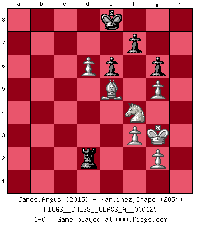 Last move : 1-0 2013 September 18 2:11:35 [Event "FICGS__CHESS__CLASS_A__000129"] [Site "FICGS"] [Date "2012.10.28"] [Round "1"] [White "James,Angus"] [Black "Martinez,Chapo"] [Result "1-0"] [WhiteElo "2015"] [BlackElo "2054"] 1.e4 c5 2.Nf3 Nc6 3.Bb5 Qc7 4.O-O e6 5.Re1 Nge7 6.c3 a6 7.Ba4 b5 8.Bc2 Bb7 9.d4 cxd4 10.cxd4 Ng6 11.a4 Nb4 12.Bb3 bxa4 13.Rxa4 a5 14.h4 h5 15.Nc3 Ba6 16.Ra1 Be7 17.e5 Rb8 18.Re3 Nf4 19.Ng5 Nbd3 20.Bc2 Nxb2 21.Qf3 Bxg5 22.hxg5 Ne2+ 23.Nxe2 Qxc2 24.Nf4 Nc4 25.Rc3 Qf5 26.Qe2 Qg4 27.Qc2 h4 28.Ra4 Rb4 29.Rb3 Rxb3 30.Qxb3 O-O 31.Rxc4 Bxc4 32.Qxc4 Qd1+ 33.Kh2 g6 34.Ba3 Ra8 35.Qc3 a4 36.Be7 Qg4 37.Nh3 Qd1 38.f3 a3 39.Bxa3 Qe2 40.Qb2 Qf1 41.Ng1 Qd1 42.Qc3 Rb8 43.Bb4 Qb1 44.Ba5 Qd1 45.Qd2 Qa1 46.Bc3 Qf1 47.Bb4 Qb1 48.Ba3 Ra8 49.Qc1 Qd3 50.Bd6 Kg7 51.Bc5 Kg8 52.Qe1 Ra2 53.Qxh4 Qf1 54.Qg4 Ra1 55.d5 Rc1 56.dxe6 dxe6 57.Ba7 Ra1 58.Bb6 Kg7 59.Qh4 Ra2 60.Qg3 Qb5 61.Bd8 Kf8 62.Bf6 Ke8 63.Qe1 Qb2 64.Qf1 Kd7 65.Kg3 Qd2 66.Nh3 Qe2 67.Qg1 Kc6 68.Nf4 Qd2 69.Be7 Kd7 70.Qc5 Qa5 71.Qd6+ Ke8 72.Bf8 Qd8 73.Bg7 Qxd6 74.exd6 Rd2 75.Be5 1-0 Sicilian : Nimzovich-Rossolimo attack (without ...d6) Kingside Castling by player White (move 4) Kingside Castling by player Black (move 30) Player White won this chess game. Follow this game move after move (download)Discovered check is the dive bomber of the Chessboard. (Reuben Fine) Wenn Spassky eine Figur opfert kannst du genauso gut aufgeben. Aber wenn Tal eine Figur opfert, spiel weiter. Er könnte noch eine weitere opfern, und dann ... wer weiß? (Miguel Najdorf) La batalla por la última verdad nunca sera ganada. Y es por eso que el Ajedrez es tan fascinante. (Hans Kmoch) Les Cavaliers se révèlent fort utiles dans les positions fermées. D'habitude, les Fous sont un peu plus forts que les Cavaliers dans les positions ouvertes. Qu'on le veuille ou non, il restera toujours des exceptions ! For a mechanic, you seem to do an excessive amount of thinking. (C-3PO in Star Wars ep.2)