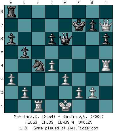 Last move : 1-0 2012 December 14 5:12:10 [Event "FICGS__CHESS__CLASS_A__000129"] [Site "FICGS"] [Date "2012.10.28"] [Round "1"] [White "Martinez,Chapo"] [Black "Gorbatov,Valentin"] [Result "1-0"] [WhiteElo "2054"] [BlackElo "2000"] 1.d4 Nf6 2.c4 e6 3.Nf3 d5 4.Nc3 Be7 5.Bf4 Nc6 6.e3 O-O 7.Rc1 Nh5 8.Bg3 a6 9.a3 Nxg3 10.hxg3 h6 11.Bd3 dxc4 12.Bxc4 b5 13.Bd3 Bb7 14.Bb1 Bd6 15.g4 Na5 16.Qc2 f5 17.gxf5 exf5 18.Nh4 Rf7 19.Nxf5 Kf8 20.Ne4 Bxe4 21.Qxe4 Qe8 22.Nxd6 cxd6 23.Qh7 Nc4 24.Bg6 Qe6 25.Bxf7 Kxf7 26.Rh4 1-0 Queen's pawn game Kingside Castling by player Black (move 6) Player White won this chess game. Follow this game move after move (download)If you aren't afraid of Spassky, then I have removed the element of money. (Jim Slater) Im Schach nämlich geht es darum, daß Ich des Gegners klein zu kriegen, sein Ego zu zerbrechen und zu zermahlen, seine Selbstachtung zu zertreten und zu verscharren und seine ganze mißachtenswerte sogenannte Persönlichkeit ein für alle Mal tot zu hacken und zu zerstampfen und dadurch die menschliche Gesellschaft von einer stinkenden Pestbeule zu befreien. Es ist ein königliches Spiel. (Robert James Fischer) El Ajedrez es tan interesante por sí solo, que no es necesario un interés monetario para persuadir a una persona a que lo practique; por lo tanto, nunca se juega por dinero. (Benjamin Franklin) Je fais ceci parce que dans cinquante coups j'obtiendrai cela; je m'appelle Mikhail Moisevitch Botvinnik. (Botvinnik) Experiences are the keys to life. (Daniel Parmet)