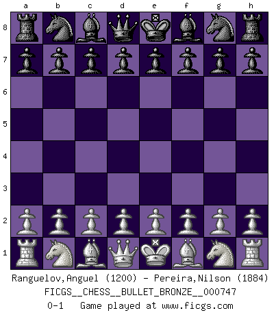Last move : 0-1 2012 October 29 9:52:54 [Event "FICGS__CHESS__BULLET_BRONZE__000747"] [Site "FICGS"] [Date "2012.10.29"] [Round "1"] [White "Ranguelov,Anguel"] [Black "Pereira,Nilson"] [Result "0-1"] [WhiteElo "1200"] [BlackElo "1884"] 0-1 This chess game has been lost on time (started : 2012.10.29 7:31:29) Player Black won this chess game. Follow this game move after move (download)Of all my Russian books, the defense contains and diffuses the greatest 'warmth' which may seem odd seeing how supremely abstract Chess is supposed to be. (Vladimir Nabokov) Nur ein wirklich starker Spieler weiß wie schwach er spielt. (Savielly Grigorievitsch Tartakower) No puedes jugar al Ajedrez si eres de corazón noble. (Proverbio Francés) Soyez une menace à chaque fois que vous vous asseyez pour jouer. (Ken Smith) Life is painting a picture, not doing a sum. (Oliver Wendell Holmes, Jr.)