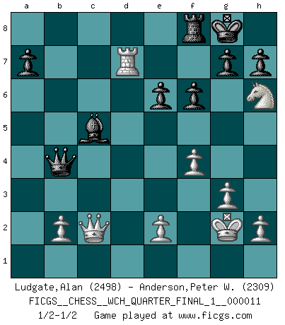 Last move : 1/2-1/2 2012 December 15 21:40:5 [Event "FICGS__CHESS__WCH_QUARTER_FINAL_1__000011"] [Site "FICGS"] [Date "2012.11.01"] [Round "3"] [White "Ludgate,Alan"] [Black "Anderson,Peter W."] [Result "1/2-1/2"] [WhiteElo "2498"] [BlackElo "2309"] 1.c4 e6 2.g3 d5 3.Bg2 Nf6 4.Nf3 Be7 5.O-O O-O 6.d4 dxc4 7.Qc2 b5 8.a4 b4 9.Nbd2 Bb7 10.Nxc4 Be4 11.Qb3 Na6 12.Be3 c5 13.Rfd1 Bd5 14.Nfe5 Rc8 15.Rac1 cxd4 16.Bxd4 Nc5 17.Qc2 b3 18.Qc3 Nfe4 19.Qe3 Bg5 20.f4 Be7 21.Nd3 Nxd3 22.Qxd3 Nc5 23.Bxc5 Rxc5 24.Bxd5 Qxd5 25.Qxb3 Qc6 26.Ne5 Qe4 27.Qd3 Qxa4 28.Rxc5 Bxc5+ 29.Kg2 Qb4 30.Qc2 Re8 31.Rd7 f6 32.Ng4 Rf8 33.Nh6+ 1/2-1/2 English Opening Kingside Castling by player White (move 5) Kingside Castling by player Black (move 5) This chess game ended in a draw. Follow this game move after move (download)I am still a victim of Chess. It has all the beauty of art and much more. It cannot be commercialized. Chess is much purer than art in its social position. (Marcel Duchamp) Ich verachte Kasparow. (Viktor Kortschnoi) El Ajedrez detiene a su maestro dentro de sus propios vínculos, encadenando la mente y el cerebro, por lo que la libertad interior del mas fuerte debe sufrir. (Albert Einstein) Fischer est le meilleur joueur du monde et Karpov n'est qu'un joueur de bistrot. (Garry Kasparov, agé de 16 ans) In my experience, there's no such thing as luck. (Obi-Wan Kenobi in Star Wars ep.4)