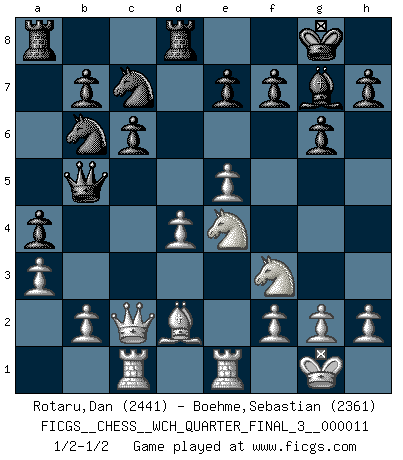 Last move : 1/2-1/2 2013 January 16 1:7:15 [Event "FICGS__CHESS__WCH_QUARTER_FINAL_3__000011"] [Site "FICGS"] [Date "2012.11.01"] [Round "1"] [White "Rotaru,Dan"] [Black "Boehme,Sebastian"] [Result "1/2-1/2"] [WhiteElo "2441"] [BlackElo "2361"] 1.d4 Nf6 2.c4 g6 3.Nf3 Bg7 4.Nc3 d5 5.Qb3 dxc4 6.Qxc4 O-O 7.e4 a6 8.e5 Nfd7 9.Be3 Nc6 10.Be2 Nb6 11.Qc5 a5 12.O-O Nb4 13.Ne4 Bf5 14.Ng3 Bd3 15.a3 Bxe2 16.Nxe2 N4d5 17.Bd2 Qd7 18.Rac1 Rfd8 19.Qc2 a4 20.Ng3 Qb5 21.Ne4 c6 22.Rfe1 Nc7 23.Nc5 Nd7 24.Ne4 Nb6 25.Nc5 Nd7 26.Ne4 Nb6 1/2-1/2 King's Indian, 3.Nf3 Kingside Castling by player Black (move 6) Kingside Castling by player White (move 12) This chess game ended in a draw. Follow this game move after move (download)No Chess Grandmaster is normal; they only differ in the extent of their madness. (Viktor Korchnoi) Dieses schreckliche Gefühl, dass ich gegen eine Maschine spielte, die niemals Fehler macht, zerschmetterte meinen Widerstand. (Mark Taimanov) El ganar no lo es todo... pero el perder es nada. (Mednis) Les échecs sont plus proches de l'art de l'assassinat que de l'art de la guerre. (Arturo Perez-Reverte) Life is pain my dear and anyone who says otherwise is selling something. (Princess Bride)