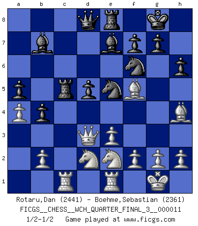 Last move : 1/2-1/2 2013 January 14 23:17:57 [Event "FICGS__CHESS__WCH_QUARTER_FINAL_3__000011"] [Site "FICGS"] [Date "2012.11.01"] [Round "5"] [White "Rotaru,Dan"] [Black "Boehme,Sebastian"] [Result "1/2-1/2"] [WhiteElo "2441"] [BlackElo "2361"] 1.d4 d5 2.c4 e6 3.Nc3 Nf6 4.cxd5 exd5 5.Bg5 c6 6.e3 Bd6 7.Bd3 h6 8.Bh4 O-O 9.Qc2 Re8 10.Nge2 a5 11.a3 b6 12.Na4 Be7 13.O-O Bb7 14.Rfe1 Nbd7 15.Rac1 Bf8 16.Bf5 Be7 17.Nac3 b5 18.a4 b4 19.Nb1 Rc8 20.Nd2 c5 21.dxc5 Rxc5 22.Qd3 Ne5 23.Qd4 Nc6 24.Qd3 Ne5 1/2-1/2 QGD : Exchange, positional line, 5...c6 Kingside Castling by player Black (move 8) Kingside Castling by player White (move 13) This chess game ended in a draw. Follow this game move after move (download)No other master has such a terrific will to win. At the board he radiates danger, and even the strongest opponents tend to freeze, like rabbits when they smell a panther. Even his weaknesses are dangerous. As white, his opening game is predictable - you can make plans against it - but so strong that your plans almost never work. In the middle game his precision and invention are fabulous, and in the end game you simply cannot beat him. (Anonymous German Expert) Kein Schachspieler kann gut schlafen. (H. G. Wells) Los Peones son nacidos libres, y aún así, se encuentran por doquier encadenados. (Rick Kennedy) Aux échecs, l'amour-propre est satisfait quand on remporte la victoire, mais il n'y a pas de honte à être battu. (Benjamin Franklin) There are two types of people in this world, good and bad. The good sleep better, but the bad seem to enjoy the waking hours much more. (Woody Allen)