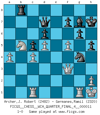 Last move : 1-0 2013 April 9 0:38:44 [Event "FICGS__CHESS__WCH_QUARTER_FINAL_4__000011"] [Site "FICGS"] [Date "2012.11.01"] [Round "7"] [White "Archer,J. Robert"] [Black "Germanes,Ramil"] [Result "1-0"] [WhiteElo "2482"] [BlackElo "2320"] 1.e4 c5 2.Nc3 d6 3.Nge2 Nf6 4.d4 cxd4 5.Nxd4 a6 6.Be3 e5 7.Nb3 Be6 8.f3 h5 9.Nd5 Bxd5 10.exd5 Nbd7 11.Qd2 g6 12.Be2 Bg7 13.O-O O-O 14.Rac1 Qc7 15.c4 b6 16.Na1 Rfe8 17.Nc2 Nc5 18.Kh1 e4 19.b4 exf3 20.gxf3 Ncd7 21.Nd4 Ne5 22.Rg1 Kh7 23.Bg5 Qb7 24.a4 Rac8 25.b5 axb5 26.Nxb5 Qd7 27.Rg2 Kg8 28.Qb4 Rc5 29.Qb3 Rec8 30.R2g1 Rb8 31.Bd2 Kh7 32.Be3 Bh6 33.f4 Neg4 34.Bxg4 Nxg4 35.Bxc5 bxc5 36.Qf3 Bg7 37.f5 1-0 Sicilian : Closed Kingside Castling by player White (move 13) Kingside Castling by player Black (move 13) Player White won this chess game. Follow this game move after move (download)A chess genius has died; a loss for humanity. (Viktor Kortchnoi, about Bobby Fischer's death) Privat ist Kortschnoi kein schlechter Mensch, sehr sympathisch. Aber während des Spiels ist er grausam. Er will dich töten. (Miguel Najdorf) Si tu oponente no puede hacer nada activo, entonces no apures la posición; En vez de eso, dejalo estar sentado ahí, sufriendo y rogandote por un empate. (Jeremy Silman) La tactique, c'est ce que vous faites quand il y a quelque chose à faire; la stratégie, c'est ce que vous faites quand il n'y a rien à faire. (Savielli Tartacower) At last I discovered the true beauty of chess. So I proposed to her. (Dinesh De Silva)