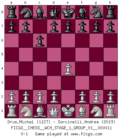 Last move : 0-1 2012 December 2 23:28:21 [Event "FICGS__CHESS__WCH_STAGE_1_GROUP_01__000011"] [Site "FICGS"] [Date "2012.11.01"] [Round "1"] [White "Drus,Michal"] [Black "Sorcinelli,Andrea"] [Result "0-1"] [WhiteElo "1127"] [BlackElo "2019"] 1.e4 c6 0-1 This chess game has been lost on time (started : 2012.11.01 17:0:17) Caro-Kann defense Player Black won this chess game. Follow this game move after move (download)Via the squares on the chessboard, the Indians explain the movement of time and the age, the higher influences which control the world and the ties which link Chess with the human soul. (Al-Masudi) Charakterschwächen offenbaren sich normalerweise während einer Schachpartie. (Garry Kasparov) El Ajedrez es un cuento de Hadas de las 1001 metidas de pata. (Savielly Tartakower) Ce qui caractérise les parties de combat, c'est que si le défenseur a constamment de difficiles problèmes à résoudre, l'attaquant doit chercher sans relâche de nouvelles possibilités d'attaque. (Koblentz) The arrogant army will lose certainly the battle. (Chinese proverb)