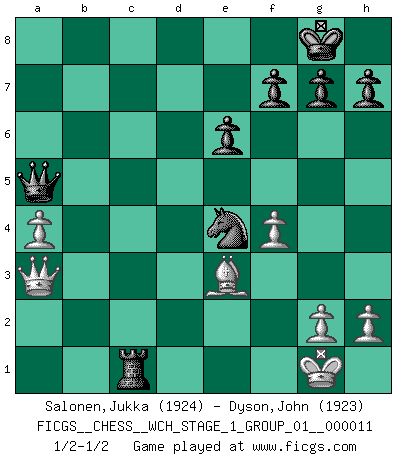 Last move : 1/2-1/2 2012 November 27 15:19:26 [Event "FICGS__CHESS__WCH_STAGE_1_GROUP_01__000011"] [Site "FICGS"] [Date "2012.11.01"] [Round "1"] [White "Salonen,Jukka"] [Black "Dyson,John"] [Result "1/2-1/2"] [WhiteElo "1924"] [BlackElo "1923"] 1.e4 c6 2.d4 d5 3.e5 Bf5 4.Nf3 e6 5.Be2 c5 6.Be3 cxd4 7.Nxd4 Ne7 8.Nd2 Nbc6 9.N2f3 Be4 10.O-O Ng6 11.Nxc6 bxc6 12.Nd4 Nxe5 13.f3 Bg6 14.f4 Nd7 15.Nxc6 Qc7 16.Nd4 Bc5 17.Qd2 Qd6 18.Rac1 O-O 19.c4 Rac8 20.cxd5 Qxd5 21.b4 Bb6 22.a4 a5 23.bxa5 Bxa5 24.Qb2 Nc5 25.Qa3 Ne4 26.Nb3 Nc3 27.Bf3 Be4 28.Nxa5 Qxa5 29.Bxe4 Nxe4 30.Rxc8 Rxc8 31.Rc1 Rxc1+ 1/2-1/2 Caro-Kann : Advance variation Kingside Castling by player White (move 10) Kingside Castling by player Black (move 18) This chess game ended in a draw. Follow this game move after move (download)Discovered check is the dive bomber of the Chessboard. (Reuben Fine) Ich habe die besten Aussichten, den ersten Preis zu gewinnen - denn jeder muss gegen Steinitz spielen, nur ich nicht! (Wilhelm Steinitz) El estómago es una parte esencial del maestro de Ajedrez. (Bent Larsen) Même un GMI sait rarement calculer sur plus de cinq coups une attaque à sacrifices. (Rudolf Spielmann) Train yourself to let go of everything you fear to lose. (Master Yoda in Star Wars ep.3)