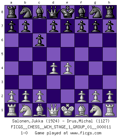 Last move : 1-0 2012 December 3 11:27:46 [Event "FICGS__CHESS__WCH_STAGE_1_GROUP_01__000011"] [Site "FICGS"] [Date "2012.11.01"] [Round "1"] [White "Salonen,Jukka"] [Black "Drus,Michal"] [Result "1-0"] [WhiteElo "1924"] [BlackElo "1127"] 1.e4 c6 2.d4 1-0 This chess game has been lost on time (started : 2012.11.01 17:0:17) Caro-Kann defense Player White won this chess game. Follow this game move after move (download)Pawns are born free, yet they are everywhere in chains. (Rick Kennedy) Vom Schach wurde gesagt das Leben sei dafür nicht lange genug. Aber das ist der Fehler des Lebens, nicht des Schach'. (Irving Chernev) Durante una competencia de Ajedrez, un Maestro de Ajedrez deberá ser una combinación de presa de caza y un Monge. (Alexander Alekhine) Nous sommes les pions de la mystérieuse partie d'Echecs jouée par Dieu. Il nous déplace, nous arrête, nous pousse encore, puis nous lance un à un dans la boîte du Néant. Epitaphe sur la tombe de David Janowsky (1868-1927). Mandala - that's it! 16x16 squares as multiple of the four and the eight because of the Four Noble Truths and the Noble Eightfold Path. (Heinz-Georg Lehnhoff about Big Chess)