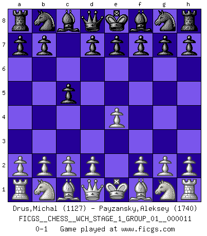 Last move : 0-1 2012 December 3 11:27:46 [Event "FICGS__CHESS__WCH_STAGE_1_GROUP_01__000011"] [Site "FICGS"] [Date "2012.11.01"] [Round "1"] [White "Drus,Michal"] [Black "Payzansky,Aleksey"] [Result "0-1"] [WhiteElo "1127"] [BlackElo "1740"] 1.e4 c5 0-1 This chess game has been lost on time (started : 2012.11.01 17:0:17) Sicilian defense Player Black won this chess game. Follow this game move after move (download)Weak points or holes in the opponent's position must be occupied by pieces not Pawns. (Siegbert Tarrasch) Zum Sieg gelangt man nicht, wenn man gut, sondern nur wenn man besser spielt (Savielly Grigorievitsch Tartakower) El Ajedrez es un juego de pelea el cual es puramente intelectual e incluye la suerte. (Richard Reti) Ne tendez aucun piège pour le plaisir ! Ne jouez rien dans l'espoir que l'adversaire réagisse de façon stupide ! Prenez toujours pour acquis que l'adversaire va trouver le meilleur coup ! Ne jouez jamais de coup dans l'espoir que l'adversaire ne voie pas la menace ! Chacun de vos coups doit améliorer la position d'une façon ou d'une autre. A proverb is a short sentence based on long experience. (Miguel de Cervantes)