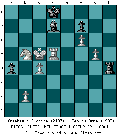 Last move : 1-0 2013 February 4 16:59:12 [Event "FICGS__CHESS__WCH_STAGE_1_GROUP_02__000011"] [Site "FICGS"] [Date "2012.11.01"] [Round "1"] [White "Kasabasic,Djordje"] [Black "Pentru,Oana"] [Result "1-0"] [WhiteElo "2137"] [BlackElo "1933"] 1.e4 e5 2.Nf3 Nc6 3.Bb5 Nf6 4.O-O Nxe4 5.d4 Nd6 6.Bxc6 dxc6 7.dxe5 Nf5 8.Qxd8+ Kxd8 9.Nc3 Ke8 10.Rd1 h6 11.h3 Be6 12.g4 Ne7 13.Nd4 Bd7 14.Kg2 Ng6 15.f4 Be7 16.Be3 h5 17.Kg3 Bh4+ 18.Kf3 Be7 19.Nf5 Nh4+ 20.Nxh4 Bxh4 21.f5 Rd8 22.Kf4 Be7 23.Bxa7 hxg4 24.hxg4 b6 25.a4 Rh3 26.Ne4 c5 27.a5 bxa5 28.Bxc5 Bxc5 29.Nxc5 Bc6 30.Rxd8+ Kxd8 31.Rd1+ Ke7 32.Kg5 Rh2 33.f6+ gxf6+ 34.exf6+ Ke8 35.Na6 Bd7 36.Nxc7+ Kd8 37.Nb5 Rh8 38.Rd4 Rg8+ 39.Kh4 Rh8+ 40.Kg3 Rh6 41.g5 Rh3+ 42.Kg2 Rh5 43.Rd5 Rh4 44.Kg3 Rh3+ 45.Kf4 Rh4+ 46.Ke3 a4 47.c4 Rh3+ 48.Kd4 Rh4+ 49.Kc5 1-0 Ruy Lopez : Berlin defense, Open variation Kingside Castling by player White (move 4) Player White won this chess game. Follow this game move after move (download)Chess, like love, like music, has the power to make people happy. (Siegbert Tarrasch) Heutzutage gewinnt im Turnier nicht derjenige Spieler, der weitreichende Pläne entwirft, sondern einfach jener, der Zug um Zug kämpft. (David Bronstein) No todos los artistas son jugadores de Ajedrez, pero todos los jugadores de Ajedrez son artistas. (Marcel Duchamp) Les échecs, c'est la lutte contre l'erreur. (Johannes Zukertort) Life is like a ten-speed bicycle: most of us have gears we never use. (Charles M. Schulz)
