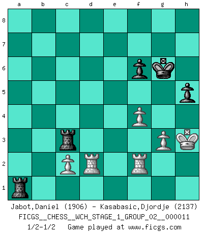 Last move : 1/2-1/2 2013 March 4 6:56:31 [Event "FICGS__CHESS__WCH_STAGE_1_GROUP_02__000011"] [Site "FICGS"] [Date "2012.11.01"] [Round "1"] [White "Jabot,Daniel"] [Black "Kasabasic,Djordje"] [Result "1/2-1/2"] [WhiteElo "1906"] [BlackElo "2137"] 1.e4 c5 2.Nf3 d6 3.d4 cxd4 4.Nxd4 Nf6 5.Nc3 a6 6.Bg5 Nc6 7.Qd2 e6 8.O-O-O Bd7 9.f4 h6 10.Bh4 b5 11.a3 Be7 12.Nf3 b4 13.axb4 Nxb4 14.Bc4 Qc7 15.Bb3 a5 16.e5 a4 17.Bxe6 a3 18.Bxd7+ Nxd7 19.bxa3 Qxc3 20.Qxc3 Na2+ 21.Kb2 Nxc3 22.Kxc3 dxe5 23.Bxe7 Kxe7 24.Nxe5 Nxe5 25.Rhe1 Rxa3+ 26.Kb4 Rha8 27.Rxe5+ Kf8 28.g3 f6 29.Re2 R8a4+ 30.Kb5 Ra5+ 31.Kc4 R5a4+ 32.Kd5 Rc3 33.Ke6 Kg8 34.Kf5 Kh7 35.Kg4 Rc7 36.h4 Ra2 37.R1d2 g6 38.h5 gxh5+ 39.Kxh5 Rc5+ 40.Kg4 h5+ 41.Kh4 Kg6 42.Rf2 Ra1 43.Kh3 Rc3 1/2-1/2 Sicilian : Najdorf, 6.Bg5 Queenside Castling by player White (move 8) This chess game ended in a draw. Follow this game move after move (download)Half the variations which are calculated in a tournament game turn out to be completely superfluous. Unfortunately, no one knows in advance which half. (Jan Tinman) Der 70jährige Viktor Kortschnoi: Die Rentenanstalt wollte mich zwingen in Rente zu gehen. Meine Frau erhält jetzt eine Pension- und ich zahle weiter in die Rentenkasse ein! (Viktor Kortschnoi) Ayuda a tus piezas para que ellas te puedan ayudar. (Paul Morphy) Pour moi, les échecs ne sont pas un jeu mais un art. (Alexandre Alekhine) A married woman is like a fish riding a bicycle. (Rodolfo d'Ettorre)