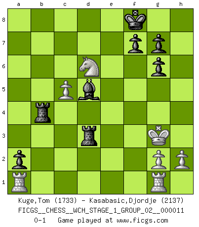 Last move : 0-1 2012 December 6 20:9:37 [Event "FICGS__CHESS__WCH_STAGE_1_GROUP_02__000011"] [Site "FICGS"] [Date "2012.11.01"] [Round "1"] [White "Kuge,Tom"] [Black "Kasabasic,Djordje"] [Result "0-1"] [WhiteElo "1733"] [BlackElo "2137"] 1.e4 c5 2.a3 Nc6 3.b4 cxb4 4.axb4 Nxb4 5.d4 d5 6.Ba3 e5 7.c3 Nc6 8.Bxf8 Kxf8 9.dxe5 dxe4 10.Qxd8+ Nxd8 11.Nd2 Nc6 12.f4 exf3 13.Ngxf3 Nge7 14.Bd3 Ng6 15.Nc4 Be6 16.Bxg6 hxg6 17.Nd6 Rh5 18.Nxb7 Nxe5 19.Nxe5 Rxe5+ 20.Kf2 a5 21.Rhe1 Rf5+ 22.Kg3 a4 23.Nd6 Rd5 24.Ne4 a3 25.c4 Rd4 26.c5 R8a4 27.Nd6 a2 28.Nb5 Rd3+ 29.Kf2 Rd2+ 30.Kg3 Bd5 31.Rg1 Rb4 32.Nd6 Rd3+ 0-1 Sicilian defense Player Black won this chess game. Follow this game move after move (download)Bobby Fischer is the greatest Chess player who has ever lived. (Ken Smith) Bis jetzt ist Weiß einer wohlbekannten Analyse gefolgt. Aber jetzt begeht er einen schrecklichen Fehler: Er beginnt seinen eigenen Kopf zu benutzen. (Siegbert Tarrasch) El sobresalir en el Ajedrez es un signo de una mente intrigante. (Sir Arthur Conan Doyle) On n'a jamais que l'âge auquel on a commence à jouer aux échecs car après on cesse de vieillir. (Capablanca) In my experience, there's no such thing as luck. (Obi-Wan Kenobi in Star Wars ep.4)