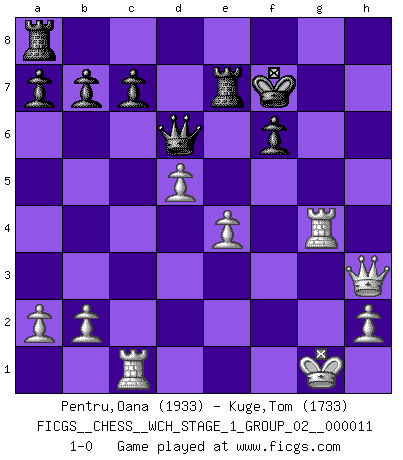 Last move : 1-0 2012 November 26 18:46:5 [Event "FICGS__CHESS__WCH_STAGE_1_GROUP_02__000011"] [Site "FICGS"] [Date "2012.11.01"] [Round "1"] [White "Pentru,Oana"] [Black "Kuge,Tom"] [Result "1-0"] [WhiteElo "1933"] [BlackElo "1733"] 1.e4 e5 2.Nf3 Nf6 3.Nxe5 d6 4.Nf3 Nxe4 5.d4 d5 6.Bd3 Nc6 7.O-O Bg4 8.c4 Nf6 9.Nc3 Nxd4 10.cxd5 Nxf3+ 11.gxf3 Bh3 12.Re1+ Be7 13.Qe2 Kf8 14.Bf4 Bd6 15.Bxd6+ Qxd6 16.Qe3 g5 17.Ne4 Nxe4 18.fxe4 Qd7 19.Qc5+ Kg7 20.Qc3+ f6 21.Re3 Rhe8 22.Rg3 g4 23.f3 h5 24.fxg4 hxg4 25.Bf1 Bxf1 26.Rxf1 Qd6 27.Rxg4+ Kf7 28.Rc1 Re7 29.Qh3 1-0 Petrov : Classical attack Kingside Castling by player White (move 7) Player White won this chess game. Follow this game move after move (download)There is no remorse like the remorse of Chess. (H. G. Wells) Wir können eben der zündenden Macht des Opfers nicht wiederstehen, denn die Begeisterung für das Opfer liegt in der Natur des Menschen. (Rudolf Spielmann) Evita las multitudes. Haz independientemente tu propio razonamiento. Trata de ser el jugador de Ajedrez, no la pieza de Ajedrez. (Ralph Charell) Les échecs sont un jeu par leur forme, un art par leur essence et une science par sa difficulté d'acquisition. Ils peuvent vous procurer autant de plaisir qu'un bon livre ou une belle musique, mais vous n'aurez une réelle joie que si vous arrivez à bien jouer. (Tigran Petrosian) There is far too much law for those who can afford it and far too little for those who cannot. (Derek Bok)
