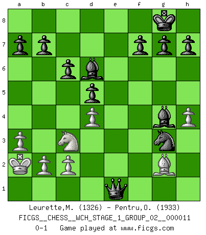 Last move : 0-1 2012 December 30 12:26:9 [Event "FICGS__CHESS__WCH_STAGE_1_GROUP_02__000011"] [Site "FICGS"] [Date "2012.11.01"] [Round "1"] [White "Leurette,Marc-Antoine"] [Black "Pentru,Oana"] [Result "0-1"] [WhiteElo "1326"] [BlackElo "1933"] 1.e4 e6 2.d4 d5 3.exd5 exd5 4.Nc3 Nf6 5.Nf3 Bd6 6.Bg5 c6 7.Bxf6 Qxf6 8.Qe2+ Be6 9.O-O-O O-O 10.g3 Nd7 11.h4 Bg4 12.Bg2 Rfe8 13.Qd3 Nb6 14.Rde1 Nc4 15.Rxe8+ Rxe8 16.Re1 Rxe1+ 17.Nxe1 Qxf2 18.Qf1 Qe3+ 19.Kb1 Nd2+ 20.Ka1 Nxf1 21.a3 Qxe1+ 22.Ka2 Nxg3 0-1 French : Exchange variation Queenside Castling by player White (move 9) Kingside Castling by player Black (move 9) Player Black won this chess game. Follow this game move after move (download)The only thing Chess players have in common is Chess. (Lodewijk Prins) Ich bin Weltmeister und muß mit niemandem irgend etwas diskutieren. (Viswanathan Anand) No es tiempo de jugar al Ajedrez cuando la casa esta en llamas. (Proverbio Italiano) Les sacrifices démontrent seulement que quelqu'un a gaffé. (Savielly Tartacover) A good player is always lucky. (Capablanca)