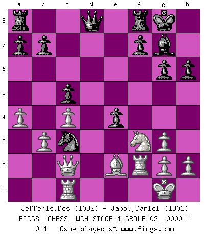 Last move : 0-1 2013 January 23 12:44:39 [Event "FICGS__CHESS__WCH_STAGE_1_GROUP_02__000011"] [Site "FICGS"] [Date "2012.11.01"] [Round "1"] [White "Jefferis,Des"] [Black "Jabot,Daniel"] [Result "0-1"] [WhiteElo "1082"] [BlackElo "1906"] 1.e4 c5 2.Nf3 d6 3.c3 Nf6 4.d3 Nc6 5.Be2 g6 6.O-O Bg7 7.Bf4 O-O 8.Nbd2 e5 9.Bg3 h6 10.Nc4 Nh5 11.a4 Nxg3 12.fxg3 Be6 13.b3 Ne7 14.Rf2 d5 15.exd5 Nxd5 16.Rc1 Nxc3 17.Qc2 Bxc4 18.dxc4 e4 0-1 This chess game has been lost on time (started : 2012.11.01 17:5:48) Sicilian Kingside Castling by player White (move 6) Kingside Castling by player Black (move 7) Player Black won this chess game. Follow this game move after move (download)Chess is like life. (Boris Spassky) Ich habe die Schachforschung dermaßen betrieben, dass sie auf eine wissenschaftliche Basis gestellt wurde. (Mikhail Moiseyevich Botvinik) ¿Cual es el objetivo de jugar una apertura de gambito?... Para adquirir una reputación de ser un jugador apuesto a costo de perder el juego. (Siegbert Tarrasch) J'ai vu le vaincu d'Echecs jouer des années durant dans l'espoir de la fête de la victoire. Car tu es plus riche de ce qu'elle existe si même elle n'est point pour toi. Ainsi de la perle du fond des mers. (Antoine de Saint-Exupéry) When you stop learning you start dying. (M. Scott Adams)