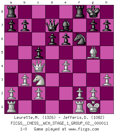 Last move : 1-0 2013 January 26 0:56:39 [Event "FICGS__CHESS__WCH_STAGE_1_GROUP_02__000011"] [Site "FICGS"] [Date "2012.11.01"] [Round "1"] [White "Leurette,Marc-Antoine"] [Black "Jefferis,Des"] [Result "1-0"] [WhiteElo "1326"] [BlackElo "1082"] 1.e4 e5 2.Nf3 Nc6 3.Bc4 Be7 4.O-O Nf6 5.Nc3 O-O 6.b3 d6 7.h3 Be6 8.Bxe6 fxe6 9.d4 exd4 10.Nxd4 Nxd4 11.Qxd4 c5 12.Qc4 Qd7 13.Bg5 1-0 This chess game has been lost on time (started : 2012.11.01 17:5:48) Hungarian defense Kingside Castling by player White (move 4) Kingside Castling by player Black (move 5) Player White won this chess game. Follow this game move after move (download)A bad day of Chess is better than any good day at work. (Anonymous) Wenn ein Kopf und ein Buch zusammenstoßen und es klingt hohl, ist es denn allemal im Buche? (Georg Christoph Lichtenberg) Los errores estan ahí, esperando a que se cometan. (Savielly Tartakower) Pour se monter efficace, un Cavalier a besoin d'avant-postes ! Les Cavaliers font les meilleurs bloqueurs de pions passés. When a man with money meets a man with experience, the man with experience leaves with money and the man with money leaves with experience. (Anonymous)