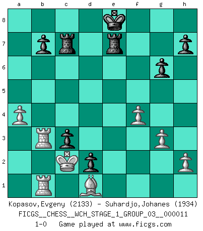 Last move : 1-0 2013 March 5 23:58:33 [Event "FICGS__CHESS__WCH_STAGE_1_GROUP_03__000011"] [Site "FICGS"] [Date "2012.11.01"] [Round "1"] [White "Kopasov,Evgeny"] [Black "Suhardjo,Johanes"] [Result "1-0"] [WhiteElo "2133"] [BlackElo "1934"] 1.d4 d5 2.c4 c6 3.Nf3 Nf6 4.Nc3 dxc4 5.a4 Bg4 6.Ne5 Nbd7 7.Nxg4 Nxg4 8.e4 e5 9.Qxg4 exd4 10.Nb1 Qa5+ 11.Nd2 d3 12.g3 Ne5 13.Qd1 Bb4 14.Bh3 Rd8 15.Kf1 Qc5 16.Kg2 O-O 17.f4 c3 18.bxc3 Qxc3 19.Ra2 Nc4 20.Re1 a5 21.e5 Nxd2 22.Bxd2 Qc4 23.Rb2 c5 24.Bg4 Qd4 25.Qa1 g6 26.Bf3 c4 27.Bxb4 axb4 28.Rxb4 d2 29.Reb1 Qxa1 30.Rxa1 c3 31.Bd1 Rc8 32.Bc2 Rc7 33.Rab1 Rd8 34.Kf3 Kf8 35.Ke2 R8d7 36.Kd1 Ke7 37.Be4 f5 38.exf6+ Kxf6 39.Kc2 Ke7 40.Bf3 Ke8 41.R4b3 Re7 42.Bd1 1-0 QGD Slav : Steiner variation Kingside Castling by player Black (move 16) Player White won this chess game. Follow this game move after move (download)Discovered check is the dive bomber of the Chessboard. (Reuben Fine) Nie in meinem Leben habe ich die französische Verteidigung gespielt, welche die Stumpfsinnigste von allen ist. (Wilhelm Steinitz) No solamente yo pronostico su triunfo sobre Botvinnik, sino que me adelanto y digo que probablemente Fischer es el jugador de Ajedrez mas grande que haya existido. (John Collins) Ne tendez aucun piège pour le plaisir ! Ne jouez rien dans l'espoir que l'adversaire réagisse de façon stupide ! Prenez toujours pour acquis que l'adversaire va trouver le meilleur coup ! Ne jouez jamais de coup dans l'espoir que l'adversaire ne voie pas la menace ! Chacun de vos coups doit améliorer la position d'une façon ou d'une autre. If you are going through hell, keep going. (Winston Churchill)