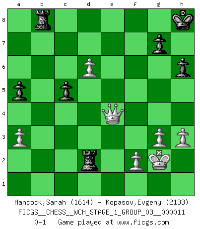 Last move : 0-1 2013 May 7 10:6:14 [Event "FICGS__CHESS__WCH_STAGE_1_GROUP_03__000011"] [Site "FICGS"] [Date "2012.12.01"] [Round "1"] [White "Hancock,Sarah"] [Black "Kopasov,Evgeny"] [Result "0-1"] [WhiteElo "1614"] [BlackElo "2133"] 1.e4 c5 2.Nc3 Nc6 3.Nf3 e5 4.Bc4 Be7 5.Nd5 Nf6 6.d3 d6 7.O-O O-O 8.c3 Nxd5 9.Bxd5 Be6 10.a3 Bxd5 11.exd5 Nb8 12.b4 Nd7 13.Be3 b6 14.c4 f5 15.Qa4 a5 16.bxc5 Nxc5 17.Qc2 Bf6 18.Rab1 Nd7 19.Rb5 Rb8 20.Rfb1 Qc7 21.h3 Bd8 22.Qd1 Kh8 23.Qe2 Rc8 24.Bxb6 Nxb6 25.Rxb6 Qxb6 26.Rxb6 Bxb6 27.Ng5 h6 28.Ne6 Rf7 29.g3 Rb8 30.Kg2 Ba7 31.Qc2 Rfb7 32.Qa4 Rb2 33.c5 Bxc5 34.Nxc5 dxc5 35.d6 e4 36.dxe4 fxe4 37.Qxe4 Rd2 0-1 Sicilian : Closed, 2...Nc6 Kingside Castling by player White (move 7) Kingside Castling by player Black (move 7) Player Black won this chess game. Follow this game move after move (download)A bad plan is better than none at all. (Frank Marshall) Schach ist wie eine schöne Frau, zu der wir ständig zurückkehren, gleichviel, wie oft sie uns zurückweist. (Anonymous) Aquel que teme a un Peón de Reina aislado, debería de retirarse del Ajedrez. (Siegbert Tarrasch) C'est la seule position que je connaisse où les deux camps sont mals. Propos prêtés à V. Anand. Indecision is the key to flexibility. (Unknown)