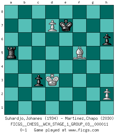 Last move : 0-1 2013 February 28 3:17:13 [Event "FICGS__CHESS__WCH_STAGE_1_GROUP_03__000011"] [Site "FICGS"] [Date "2012.11.01"] [Round "1"] [White "Suhardjo,Johanes"] [Black "Martinez,Chapo"] [Result "0-1"] [WhiteElo "1934"] [BlackElo "2030"] 1.e4 c5 2.Nf3 Nc6 3.d4 cxd4 4.Nxd4 Nf6 5.Nc3 e5 6.Nde2 Bc5 7.Ng3 O-O 8.Be2 d6 9.O-O a5 10.a3 Be6 11.Nd5 h6 12.Bc4 Bxd5 13.exd5 Ne7 14.Qf3 Qc8 15.Ne4 Nxe4 16.Qxe4 f5 17.Qd3 e4 18.Qe2 Qc7 19.Bd2 Rfc8 20.b3 Ng6 21.Bb5 Qf7 22.c4 Ne5 23.Kh1 Nd3 24.f3 Qe7 25.Bc3 Rf8 26.Qd2 Qg5 27.f4 Qh4 28.g3 Qh3 29.Qg2 Qxg2+ 30.Kxg2 g5 31.Bd7 gxf4 32.gxf4 Kh7 33.Kh1 Nf2+ 34.Rxf2 Bxf2 35.Ra2 Be3 36.Rg2 Bxf4 37.Rf2 Rad8 38.Be6 Be5 39.Bxe5 dxe5 40.Bxf5+ Kh8 41.Kg2 e3 42.Rf3 b5 43.Be6 Rxf3 44.Kxf3 a4 45.bxa4 bxc4 46.Kxe3 Kg7 47.d6 c3 48.d7 Kf6 49.Bh3 e4 50.a5 Ke7 51.Bf5 Ra8 52.Bxe4 Rxa5 53.Kd3 Rxa3 54.Bf5 Ra5 0-1 Sicilian : Pelikan (Lasker/Sveshnikov) variation Kingside Castling by player Black (move 7) Kingside Castling by player White (move 9) 10 pieces endgame at move 52 : White KBPPPP , Black KRPP WHITE : King + 1 Bishop 4 Pawns BLACK : King + 1 Rook 2 Pawns 9 pieces endgame at move 52 : White KBPPP , Black KRPP WHITE : King + 1 Bishop 3 Pawns BLACK : King + 1 Rook 2 Pawns 8 pieces endgame at move 53 : White KBPP , Black KRPP WHITE : King + 1 Bishop 2 Pawns BLACK : King + 1 Rook 2 Pawns Player Black won this chess game. Follow this game move after move (download)It is always better to sacrifice your opponent's men. (Savielly Tartakower) Ich bin der einzige Schachspieler, der sich während der Vorbereitungen zum Turnier verletzt hat. (Woody Allen) El Ajedrez es el juego mas altamente simbólico, pero las agresiones estan por lo tanto aún mas francamente representadas en la partida. Tal vez comenzo como un juego de guerra; Algo como la representación de una batalla en miniatura entre las fuerzas de dos reinos. (Karl Meninger) Votre prénom est 'Tactique', votre deuxième prénom est 'Tactique' et votre nom est 'Tactique'. (Ken Smith) Ah, the Socrating method. The best way we have of teaching everything-apart from juggling chainsaws. (Gregory House, House M.D.)