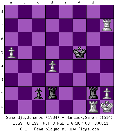 Last move : 0-1 2013 February 22 2:56:17 [Event "FICGS__CHESS__WCH_STAGE_1_GROUP_03__000011"] [Site "FICGS"] [Date "2012.12.01"] [Round "1"] [White "Suhardjo,Johanes"] [Black "Hancock,Sarah"] [Result "0-1"] [WhiteElo "1934"] [BlackElo "1614"] 1.d4 d5 2.c4 e6 3.Nc3 c5 4.cxd5 exd5 5.Nf3 Nf6 6.Bf4 Nc6 7.e3 c4 8.Be2 Bb4 9.O-O O-O 10.Ne5 Bxc3 11.bxc3 Nxe5 12.Bxe5 Ne4 13.Qc2 Bf5 14.g4 Bg6 15.Qb2 f6 16.Bf4 f5 17.gxf5 Bxf5 18.f3 Ng5 19.Kh1 Rf7 20.e4 Nxe4 21.fxe4 Bxe4+ 22.Bf3 Qe7 23.Bxe4 Qxe4+ 24.Qg2 Raf8 25.Qxe4 dxe4 26.Rfb1 Rxf4 27.Rxb7 Rf3 28.Re1 R8f4 29.Rxa7 Rxc3 30.Re7 Rc2 31.R7xe4 R4f2 32.Re8+ Kf7 33.R8e7+ Kg6 34.R1e6+ Kh5 35.Rxg7 c3 36.Rxh7+ Kg5 37.Re1 Rcd2 38.Rg1+ Kf5 39.a4 c2 40.a5 Rg2 0-1 QGD : Tarrasch defense Kingside Castling by player White (move 9) Kingside Castling by player Black (move 9) 10 pieces endgame at move 36 : White KRRPPP , Black KRRP WHITE : King + 2 Rooks 3 Pawns BLACK : King + 2 Rooks 1 Pawn Player Black won this chess game. Follow this game move after move (download)It began to feel as though you were playing against Chess itself. - On playing against Robert Fischer. (Walter Shipman) Ein typischer, sehr verbreiteter Gedankenschädling ist der, daß der betreffende Amateur von der Annanhme ausgeht, daß jeder einzelne Zug etwas zu leisten habe. (Aaron Nimzowitsch) Peones: ellos son el alma de esta partida, solos forman el ataque y la defensa. (Philidor) L'ordinateur a tué l'originalité. Il n'y a plus guère d'aventures sur l'échiquier. (Jacob Murray) The good fighters of old first put themselves beyond the possibility of defeat, and then waited for an opportunity of defeating the enemy. (Sun Tzu)