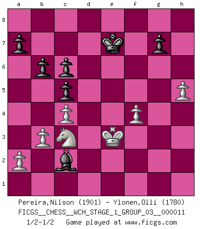 Last move : 1/2-1/2 2013 March 17 17:12:35 [Event "FICGS__CHESS__WCH_STAGE_1_GROUP_03__000011"] [Site "FICGS"] [Date "2012.11.01"] [Round "1"] [White "Pereira,Nilson"] [Black "Ylonen,Olli"] [Result "1/2-1/2"] [WhiteElo "1901"] [BlackElo "1780"] 1.e4 e5 2.Nf3 Nc6 3.Bb5 Nf6 4.O-O Nxe4 5.d4 Nd6 6.Bxc6 dxc6 7.dxe5 Nf5 8.Qxd8+ Kxd8 9.Nc3 Ke8 10.h3 h5 11.Rd1 Be7 12.Bg5 Be6 13.b3 h4 14.Rd3 Rd8 15.Rxd8+ Bxd8 16.Bxd8 Kxd8 17.Rd1+ Ke7 18.Kf1 b6 19.Ne2 Bd5 20.Nfd4 Be4 21.c4 Nxd4 22.Rxd4 Bb1 23.Nc3 Bf5 24.Ke2 Rh5 25.Ke3 Bd7 26.Re4 Ke6 27.f4 c5 28.Nb5 Ke7 29.Kf3 Bc6 30.Kg4 Bxe4 31.Kxh5 c6 32.Nc3 Bxg2 33.Kxh4 Bf1 34.Kg3 Bd3 35.Kf3 f6 36.Ke3 Bc2 37.h4 Ke6 38.exf6 Kxf6 39.h5 Kf5 40.Kf3 Ke6 41.Ke3 Ke7 42.Kf3 Ke6 43.Ke3 Ke7 1/2-1/2 Ruy Lopez : Berlin defense, Open variation Kingside Castling by player White (move 4) This chess game ended in a draw. Follow this game move after move (download)Chess, like love, like music, has the power to make people happy. (Siegbert Tarrasch) Die Leute spielen gegen mich seit 15 Jahren unter Ihren Möglichkeiten. (Robert James Fischer) Fischer es el jugador mas fuerte del mundo. De hecho, el jugador mas fuerte que jamas haya existido. (Larry Evans) Les échecs, c'est l'imagination. (David Bronstein) The existence of forgetting has never been proved: We only know that some things don't come to mind when we want them. (Friedrich Nietzsche)