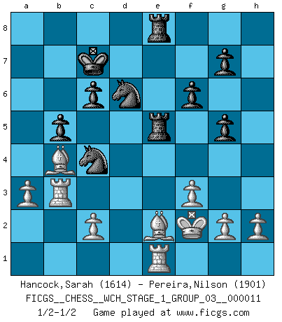 Last move : 1/2-1/2 2013 February 14 18:26:48 [Event "FICGS__CHESS__WCH_STAGE_1_GROUP_03__000011"] [Site "FICGS"] [Date "2012.12.01"] [Round "1"] [White "Hancock,Sarah"] [Black "Pereira,Nilson"] [Result "1/2-1/2"] [WhiteElo "1614"] [BlackElo "1901"] 1.d4 Nf6 2.Nf3 d5 3.Nc3 c6 4.Bf4 Bf5 5.Nh4 Bg6 6.Nxg6 hxg6 7.Qd3 e6 8.e4 Bb4 9.exd5 Qxd5 10.a3 Bxc3+ 11.bxc3 Nbd7 12.Rb1 O-O-O 13.Be2 Qe4 14.Qxe4 Nxe4 15.Rb3 e5 16.dxe5 Rhe8 17.c4 g5 18.Be3 Nxe5 19.f3 Nd6 20.Kf2 f6 21.Rhb1 Re7 22.Bxa7 Nexc4 23.Rd1 b5 24.Bc5 Re5 25.Bb4 Rde8 26.Re1 Kc7 27.Bc3 R5e6 28.Bb4 Re5 29.Bc3 R5e6 30.Bb4 Re5 1/2-1/2 Queen's pawn game Queenside Castling by player Black (move 12) This chess game ended in a draw. Follow this game move after move (download)Good positions don't win games, good moves do. (Gerald Abrahams) Modernes Schach erfordert enorme Anspannung. Es ist für einen normalen Menschen unmöglich das auszuhalten. (Viktor Kortschnoi) La táctica fluye a partir de una posición superior. (Bobby Fischer) À la honte des hommes, on sait que les lois du jeu sont les seules qui soient partout justes, claires, inviolables et exécutées. Pourquoi l'Indien qui a donné les règles du jeu d'échecs est-il obéi de bon gré dans toute la terre, et que les décrétales des papes, par exemple, sont aujourd'hui un objet d'horreur et de mépris ? C'est que l'inventeur des échecs combina tout avec justesse pour la satisfaction des joueurs, et que les papes, dans leurs décrétales, n'eurent en vue que leur seul avantage. L'Indien voulut exercer également l'esprit des hommes et leur donner du plaisir; les papes ont voulu abrutir l'esprit des hommes. Voltaire (Dictionnaire philosophique / Garnier 1967) Panic is a sudden desertion of us, an a going over to the enemy of our imagination. (Christian Nevell Bovee)