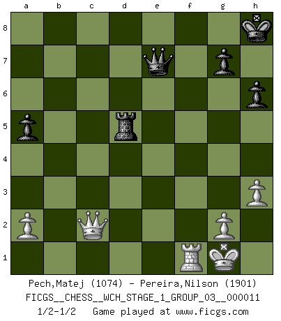 Last move : 1/2-1/2 2013 April 4 3:7:48 [Event "FICGS__CHESS__WCH_STAGE_1_GROUP_03__000011"] [Site "FICGS"] [Date "2012.11.01"] [Round "1"] [White "Pech,Matej"] [Black "Pereira,Nilson"] [Result "1/2-1/2"] [WhiteElo "1074"] [BlackElo "1901"] 1.c4 e6 2.Nc3 d5 3.d4 Nf6 4.Bg5 Be7 5.e3 O-O 6.Nf3 h6 7.Bh4 b6 8.Be2 Bb7 9.Bxf6 Bxf6 10.cxd5 exd5 11.b4 c6 12.O-O a5 13.b5 c5 14.Ne5 cxd4 15.exd4 Bxe5 16.dxe5 Nd7 17.Qd4 Rc8 18.Na4 Re8 19.f4 f6 20.Bd3 fxe5 21.fxe5 Rxe5 22.Qf2 Kh8 23.Bf5 Rc7 24.Rad1 Nf6 25.Nxb6 Ne4 26.Bxe4 Rxe4 27.Nxd5 Bxd5 28.Qf5 Rd7 29.Rxd5 Rxd5 30.Qxe4 Rxb5 31.Qc2 Rd5 32.h3 Qe7 33.Rf5 Qd8 34.Rf1 Qe7 35.Qc8+ Kh7 36.Qc2+ Kh8 1/2-1/2 English Opening Kingside Castling by player Black (move 5) Kingside Castling by player White (move 12) This chess game ended in a draw. Follow this game move after move (download)Fischer was a master of clarity and a king of artful positioning. His opponents would see where he was going but were powerless to stop him. (Bruce Pandolfini) Frage des Reporters: -Welche besonderen Umstände rechtfertigen das Anhalten der Uhren während einer Turnierpartie? Antwort: -Einen Fotographen zu strangulieren. (Siegbert Tarrasch) Hay jugadores fuertes y personas amables y yo soy un jugador fuerte. (Bobby Fischer) Votre prénom est 'Tactique', votre deuxième prénom est 'Tactique' et votre nom est 'Tactique'. (Ken Smith) To send light into the darkness of men's hearts - such is the duty of the artist. (Schumann)