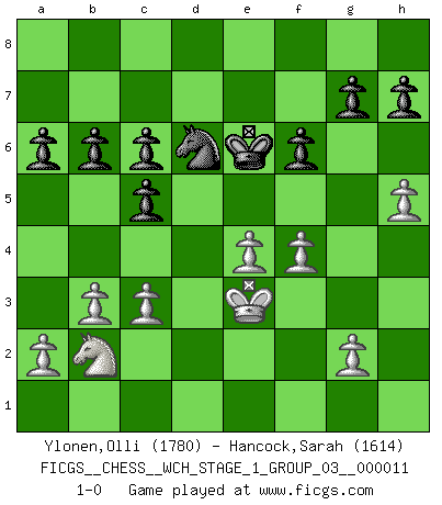 Last move : 1-0 2013 May 7 22:5:54 [Event "FICGS__CHESS__WCH_STAGE_1_GROUP_03__000011"] [Site "FICGS"] [Date "2012.12.01"] [Round "1"] [White "Ylonen,Olli"] [Black "Hancock,Sarah"] [Result "1-0"] [WhiteElo "1780"] [BlackElo "1614"] 1.e4 e5 2.Nf3 Nc6 3.Bb5 a6 4.Bxc6 dxc6 5.O-O Qf6 6.d4 exd4 7.Bg5 Qd6 8.Nxd4 Be7 9.Bxe7 Nxe7 10.Nc3 O-O 11.Nb3 Qf4 12.Nc5 Bg4 13.Qc1 Qxc1 14.Raxc1 b6 15.Nd3 Rad8 16.Rfe1 Be6 17.h4 f6 18.b3 c5 19.Nf4 Kf7 20.Rcd1 Rd4 21.Nxe6 Kxe6 22.Ne2 R4d8 23.f3 Kf7 24.Kf2 Nc6 25.Nc3 Nd4 26.Rd2 Nb5 27.Rxd8 Rxd8 28.Nd5 Rd7 29.c3 Na7 30.h5 Nc8 31.Rd1 c6 32.Ne3 Rxd1 33.Nxd1 Nd6 34.Nb2 Ke7 35.Ke3 Ke6 36.f4 1-0 Ruy Lopez : Exchange variation, 5.O-O Kingside Castling by player White (move 5) Kingside Castling by player Black (move 10) Player White won this chess game. Follow this game move after move (download)We like to think. (Gary Kasparov) Wer wird heute Abend ihr Gegner sein? -- Heute Abend spiele ich gegen die schwarzen Steine. (Akiba Rubinstein) El Ajedrez es tortura mental. (Garry Kasparov) Mais l'homme est une créature légère et illogique : semblable au joueur d'échecs, il n'aime que le processus du but à atteindre, non le but lui-même. (Dostoïevsky) Waiting for chance ? Play in casinos. (FICGS proverb)