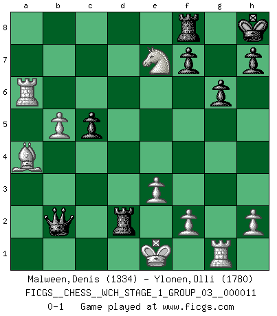 Last move : 0-1 2013 March 24 17:32:7 [Event "FICGS__CHESS__WCH_STAGE_1_GROUP_03__000011"] [Site "FICGS"] [Date "2012.11.01"] [Round "1"] [White "Malween,Denis"] [Black "Ylonen,Olli"] [Result "0-1"] [WhiteElo "1334"] [BlackElo "1780"] 1.d4 Nf6 2.c4 g6 3.Nf3 Bg7 4.Nc3 d5 5.e3 O-O 6.Bd3 c5 7.b3 Nc6 8.Bb2 Bg4 9.dxc5 Ne4 10.Qc2 Nb4 11.Bxe4 Nxc2+ 12.Bxc2 Bxf3 13.gxf3 dxc4 14.b4 Rc8 15.Na4 Bxb2 16.Nxb2 a5 17.a3 axb4 18.axb4 b6 19.Nxc4 bxc5 20.b5 Qd5 21.Nb6 Qxf3 22.Rg1 Qf6 23.Ra6 Rcd8 24.Nd5 Qb2 25.Nxe7+ Kh8 26.Ba4 Rd2 0-1 King's Indian, 3.Nf3 Kingside Castling by player Black (move 5) Player Black won this chess game. Follow this game move after move (download)Openings teach you openings. Endgames teach you chess ! (Stephan Gerzadowicz) Es ist besser die Steine des Gegners zu opfern. (Savielly Grigorievitsch Tartakower) Si el Ajedrez es una ciencia, es la mas inexacta. Si el Ajedrez es un arte, es demasiado inexacto para ser visto como tal. Si el Ajedrez es un deporte, es demasiado esotérico. Si el Ajedrez es un juego, es demasiado exigente para ser solo un juego. Si el Ajedrez es una aventura, es una muy demandante. Si el Ajedrez es una pasión, es una muy gratificante. Si el Ajedrez es la vida, es una muy triste. (Anónimo) Karpov est une pièce de musée. (Garry Kasparov) Crush them ! Make them suffer ! (General Grievous in Star Wars ep.3)