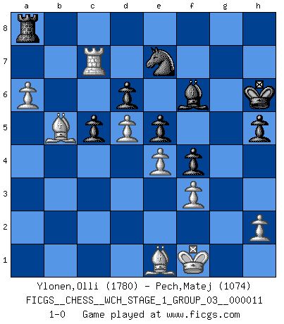 Last move : 1-0 2013 May 9 7:19:30 [Event "FICGS__CHESS__WCH_STAGE_1_GROUP_03__000011"] [Site "FICGS"] [Date "2012.11.01"] [Round "1"] [White "Ylonen,Olli"] [Black "Pech,Matej"] [Result "1-0"] [WhiteElo "1780"] [BlackElo "1074"] 1.d4 Nf6 2.c4 g6 3.Nc3 Bg7 4.e4 d6 5.Nf3 O-O 6.Be2 e5 7.O-O Nc6 8.d5 Ne7 9.Ne1 Nd7 10.Be3 f5 11.f3 f4 12.Bf2 g5 13.Rc1 Ng6 14.c5 Nxc5 15.b4 Na6 16.Nb5 Bd7 17.Nxa7 Qb8 18.Nb5 Bxb5 19.Bxb5 Nxb4 20.Rb1 Na6 21.Bc6 Ra7 22.Nd3 Qa8 23.Bb5 b6 24.a4 Nc5 25.Nxc5 bxc5 26.Be1 Ne7 27.Rf2 Rb8 28.Rfb2 Bf6 29.a5 Kg7 30.Bf1 Rxb2 31.Rxb2 h5 32.Rb5 Qc8 33.Qb3 Ra8 34.Rb7 g4 35.a6 gxf3 36.Qxf3 Kh6 37.Be2 Qg4 38.Rxc7 Qxf3 39.gxf3 Rg8+ 40.Kf1 Ra8 41.Bb5 1-0 King's Indian : Orthodox, Aronin-Taimanov variation (Yugoslav attack / Mar del Plata variation) Kingside Castling by player Black (move 5) Kingside Castling by player White (move 7) Player White won this chess game. Follow this game move after move (download)Chess is a matter of delicate judgment, knowing when to punch and how to duck. (Bobby Fischer) Nie in meinem Leben habe ich die französische Verteidigung gespielt, welche die Stumpfsinnigste von allen ist. (Wilhelm Steinitz) Me gusta decir que Bobby Fischer fue el mejor jugador que jamás haya existido. Pero lo que hizo de Fischer un genio, fue su habilidad de mezclar una frescura y pragmatismo Americano con ideas Rusas acerca de la estrategia. (Bruce Pandolfini) La vie est comme un jeu d'échecs : nous esquissons un plan, mais celui-ci est tributaire de ce que daignent faire l'adversaire aux échecs et le destin dans la vie. (Arthur Schopenhauer) Players are not good because they find tactics, it is about the way to find the positions in which those tactics are hidden. (Luc-Olivier Leclerc)