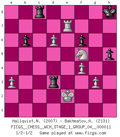 Last move : 1/2-1/2 2012 December 30 15:5:31 [Event "FICGS__CHESS__WCH_STAGE_1_GROUP_04__000011"] [Site "FICGS"] [Date "2012.11.01"] [Round "1"] [White "Hallqvist,Niklas"] [Black "Bakhmatov,Andrey"] [Result "1/2-1/2"] [WhiteElo "2007"] [BlackElo "2131"] 1.c4 Nf6 2.g3 c5 3.Bg2 Nc6 4.Nf3 e5 5.Nc3 Be7 6.O-O d6 7.d3 O-O 8.a3 Bg4 9.Rb1 h6 10.b4 Qd7 11.bxc5 dxc5 12.Bb2 Bd8 13.Nd2 Rc8 14.Nd5 b6 15.Ne4 Nxd5 16.cxd5 Ne7 17.Nc3 b5 18.Qb3 Nf5 19.Qxb5 Qxb5 20.Nxb5 Bxe2 21.Be4 Nd4 22.Nd6 Rc7 23.Rfe1 Nf3+ 24.Kg2 Nxe1+ 25.Rxe1 Bh5 26.Bxe5 Re7 27.f4 f6 28.Nf5 Rb7 29.Bd6 Re8 30.Bxc5 Rb2+ 31.Kf1 Ba5 32.Bd4 Rxh2 33.Rb1 Rd2 34.Kg1 Be2 35.Rb7 Bb6 36.Rxg7+ Kh8 37.Bxb6 axb6 38.d6 Bxd3 39.Bxd3 Rxd3 40.Re7 Rc8 41.Kf2 h5 42.Ke2 1/2-1/2 English, 1...Nf6 (Anglo-Indian defense) Kingside Castling by player White (move 6) Kingside Castling by player Black (move 7) This chess game ended in a draw. Follow this game move after move (download)All that matters on the Chessboard is good moves. (Bobby Fischer) Fischer ist das größte Genie, das je vom Schachhimmel heruntergestiegen ist. (Mikhail Nekhemyevich Tal) Para mi, el Ajedrez es la vida y cada partida es como una nueva vida. Todo jugador de Ajedrez suele vivir muchas vidas durante su vida. (Eduard Gufeld) Aux échecs, les retours au sommet sont rares : les dommages psychologiques consécutifs à une défaite sont trop sévères. (Daily Telegraph) Live, lose, and learn, by observing your opponent how to win. (Amber Steenbock)