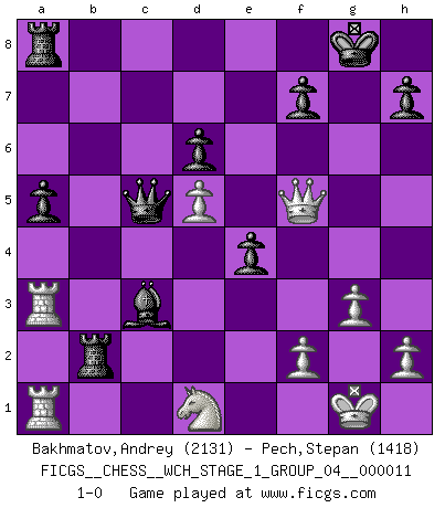 Last move : 1-0 2013 February 10 11:9:10 [Event "FICGS__CHESS__WCH_STAGE_1_GROUP_04__000011"] [Site "FICGS"] [Date "2012.11.01"] [Round "1"] [White "Bakhmatov,Andrey"] [Black "Pech,Stepan"] [Result "1-0"] [WhiteElo "2131"] [BlackElo "1418"] 1.e4 c5 2.Nf3 Nc6 3.d4 cxd4 4.Nxd4 Nf6 5.Nc3 e5 6.Ndb5 d6 7.Bg5 a6 8.Na3 b5 9.Bxf6 gxf6 10.Nd5 f5 11.c3 Bg7 12.Bd3 Be6 13.Nc2 O-O 14.O-O Bxd5 15.exd5 Ne7 16.Re1 Qd7 17.g3 Rfe8 18.a4 e4 19.Bf1 bxa4 20.Ne3 Reb8 21.Ra2 a3 22.Rxa3 Rxb2 23.Qh5 a5 24.Bh3 Qa7 25.Bxf5 Nxf5 26.Qxf5 Qc5 27.Rea1 Bxc3 28.Nd1 1-0 Sicilian : Pelikan (Lasker/Sveshnikov) variation Kingside Castling by player Black (move 13) Kingside Castling by player White (move 14) Player White won this chess game. Follow this game move after move (download)In Chess, just as in life, today's bliss may be tomorrow's poison. (Assaic) Es gibt keine einzige Frau, der ich nicht einen Springer vorgeben könnte und trotzdem gewänne. (Robert James Fischer) Con el tiempo, empecé a progresar en partidas decisivas. Tal vez porque me di cuenta de una simple verdad: no solo estaba yo nervioso sino también mi oponente. (Mikhail Tal) Les Echecs ont trois composantes : le temps, l'espace et le matériel en dernier. (Mikhail Tal) Remember : Your focus determines your reality. (Qui-Gon Jinn in Star Wars ep.1)