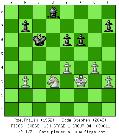 Last move : 1/2-1/2 2012 December 28 21:24:45 [Event "FICGS__CHESS__WCH_STAGE_1_GROUP_04__000011"] [Site "FICGS"] [Date "2012.11.01"] [Round "1"] [White "Roe,Philip"] [Black "Cade,Stephen"] [Result "1/2-1/2"] [WhiteElo "1952"] [BlackElo "2043"] 1.b4 e5 2.Bb2 Bxb4 3.Bxe5 Nf6 4.Nf3 O-O 5.e3 d5 6.Be2 c5 7.O-O Nc6 8.Bb2 Re8 9.d3 Ba5 10.Nbd2 d4 11.e4 Qe7 12.Nb3 Bc7 13.c3 dxc3 14.Bxc3 c4 15.Nbd2 cxd3 16.Bxd3 Bg4 17.Qc2 Rac8 18.Qb2 Red8 19.Bc4 Na5 20.Bxf6 Qxf6 21.Qxf6 gxf6 22.Bd5 Be6 23.Bxe6 fxe6 24.Rfd1 Bb6 25.Rac1 Nc4 26.Nb3 Ne3 27.Rxd8+ Rxd8 28.Ne1 Ng4 29.Rc2 Nxf2 30.Rxf2 a5 31.Kf1 a4 32.Rd2 axb3 33.Rxd8+ Bxd8 34.axb3 Kf7 35.Ke2 Ke7 36.Kf3 Bc7 37.h3 Kd6 38.Nd3 Kc6 39.g4 Bd8 40.Ke3 Bb6+ 41.Kf3 Bd8 42.Ke3 Bb6+ 43.Kf3 Bd8 1/2-1/2 Polish (Sokolsky) opening Kingside Castling by player Black (move 4) Kingside Castling by player White (move 7) This chess game ended in a draw. Follow this game move after move (download)Every Pawn is a potential Queen. (James Mason) Ein Schachspiel besteht aus drei Phasen: Die erste, wenn du hofftst den Vorteil zu haben, die zweite, wenn du glaubst einen Vorteil zu haben, und die dritte.... wenn du weißt Du wirst verlieren. (Savielly Grigorievitsch Tartakower) El Ajedrez se juega con la mente... ¡no con las manos!. (Renaud y Kahn) Les échecs sont plus proches de l'art de l'assassinat que de l'art de la guerre. (Arturo Perez-Reverte) Programming can only do so much before it becomes too much. (Don Groves)