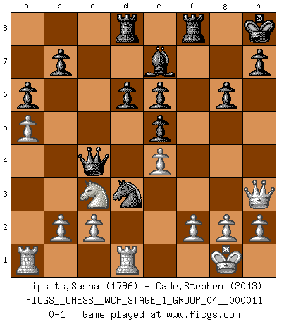 Last move : 0-1 2013 January 17 0:33:0 [Event "FICGS__CHESS__WCH_STAGE_1_GROUP_04__000011"] [Site "FICGS"] [Date "2012.11.01"] [Round "1"] [White "Lipsits,Sasha"] [Black "Cade,Stephen"] [Result "0-1"] [WhiteElo "1796"] [BlackElo "2043"] 1.e4 c5 2.Nf3 d6 3.d4 cxd4 4.Nxd4 Nf6 5.Nc3 a6 6.Be2 e6 7.O-O Be7 8.Qd3 O-O 9.Qg3 Kh8 10.Nf3 e5 11.Bg5 Be6 12.Bxf6 Bxf6 13.Rfd1 Qc7 14.Ne1 Nd7 15.a4 Be7 16.Bg4 Rad8 17.Qh3 Qc4 18.Bf5 g6 19.Bxe6 fxe6 20.a5 Nc5 21.Nd3 Nxd3 0-1 This chess game has been lost on time (started : 2012.11.01 17:11:49) Sicilian : Najdorf, Opovcensky variation Kingside Castling by player White (move 7) Kingside Castling by player Black (move 8) Player Black won this chess game. Follow this game move after move (download)Chess is a terrible game. If you have no center, your opponent has a freer position. If you do have a center, then you really have something to worry about ! (Siegbert Tarrasch) Stelle das Brett so, daß die Sonne in die Augen deines Gegners scheint. (Ruy López) La batalla por la última verdad nunca sera ganada. Y es por eso que el Ajedrez es tan fascinante. (Hans Kmoch) En blitz, le Cavalier l'emporte sur le Fou. (Vlastimil Hort) All the biggest technological inventions created by man - the airplane, the automobile, the computer - says little about his intelligence, but speaks volumes about his laziness. (Mark Kennedy)