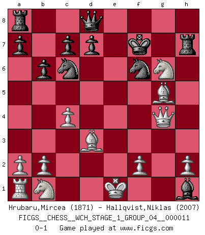 Last move : 0-1 2013 January 15 0:19:0 [Event "FICGS__CHESS__WCH_STAGE_1_GROUP_04__000011"] [Site "FICGS"] [Date "2012.11.01"] [Round "1"] [White "Hrubaru,Mircea"] [Black "Hallqvist,Niklas"] [Result "0-1"] [WhiteElo "1871"] [BlackElo "2007"] 1.d4 e6 2.c4 b6 3.e4 Bb7 4.Bd3 f5 5.exf5 Bxg2 6.Qh5+ g6 7.fxg6 Bg7 8.gxh7 Kf8 9.Ne2 Nf6 10.Qh4 Bxh1 11.Bg5 Nc6 12.Nf4 e5 13.Ng6+ Kf7 14.dxe5 Rxh7 15.Qg3 Nh5 16.Qg4 Bf6 17.exf6 Nxf6 0-1 This chess game has been lost on time (started : 2012.11.01 17:11:49) Queen's pawn : Keres defense Player Black won this chess game. Follow this game move after move (download)No price is too great for the scalp of the enemy King. (Koblentz) Ich würde mich als ganz normalen Jungen bezeichnen [Im Alter von 12]. (Sergej Karjakin) Para mi, el Ajedrez es la vida y cada partida es como una nueva vida. Todo jugador de Ajedrez suele vivir muchas vidas durante su vida. (Eduard Gufeld) Avec des compensations pour le matériel en plus... (Anonyme) He who is a good ruler must first have been ruled. (Aristotle)